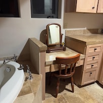 The entire lower level has wide hallways and doorways that are ADA compliant with wheelchair accessibility, leading into the large bathroom where you are greeted with a beautiful stone walk-in shower.