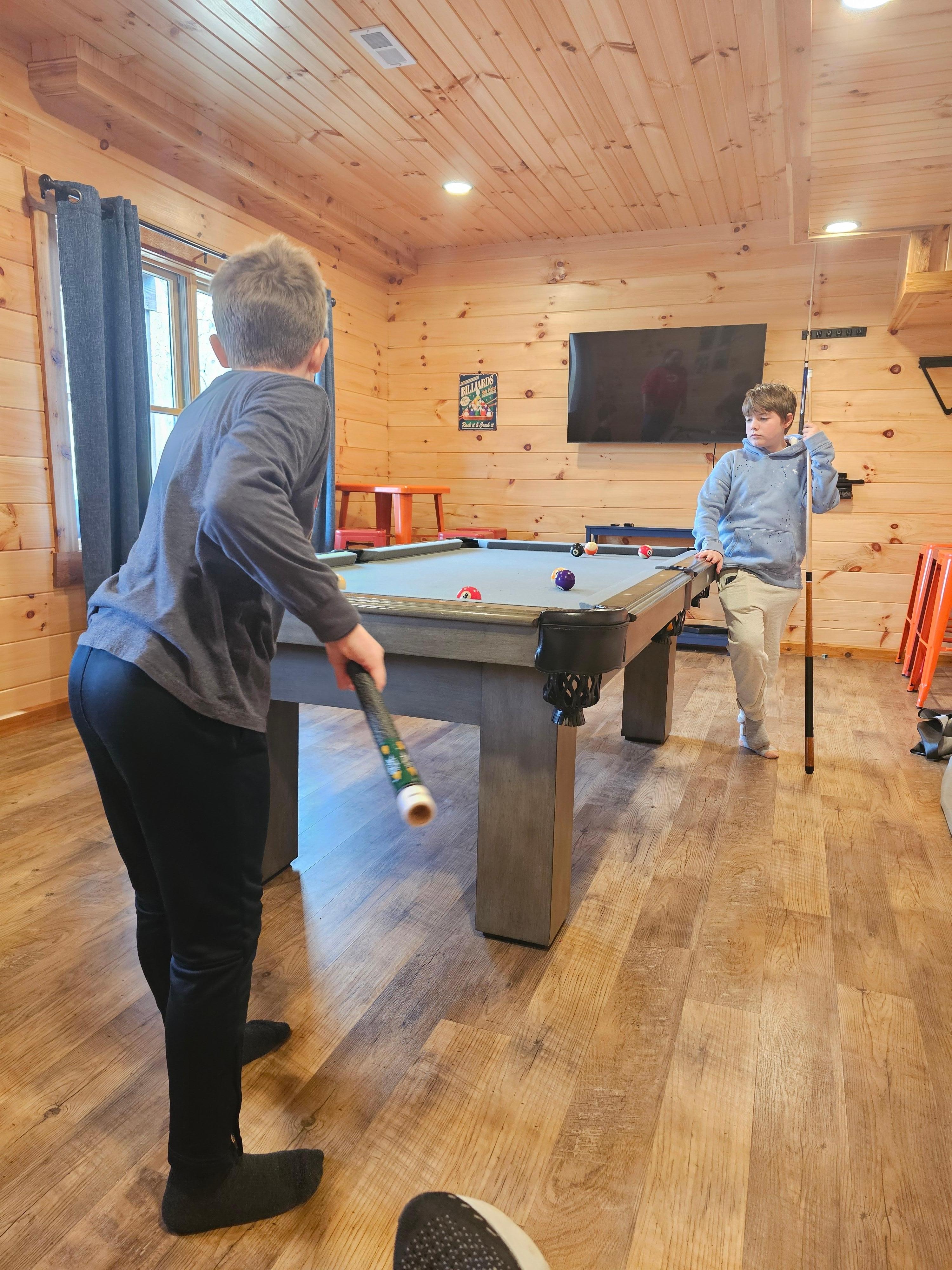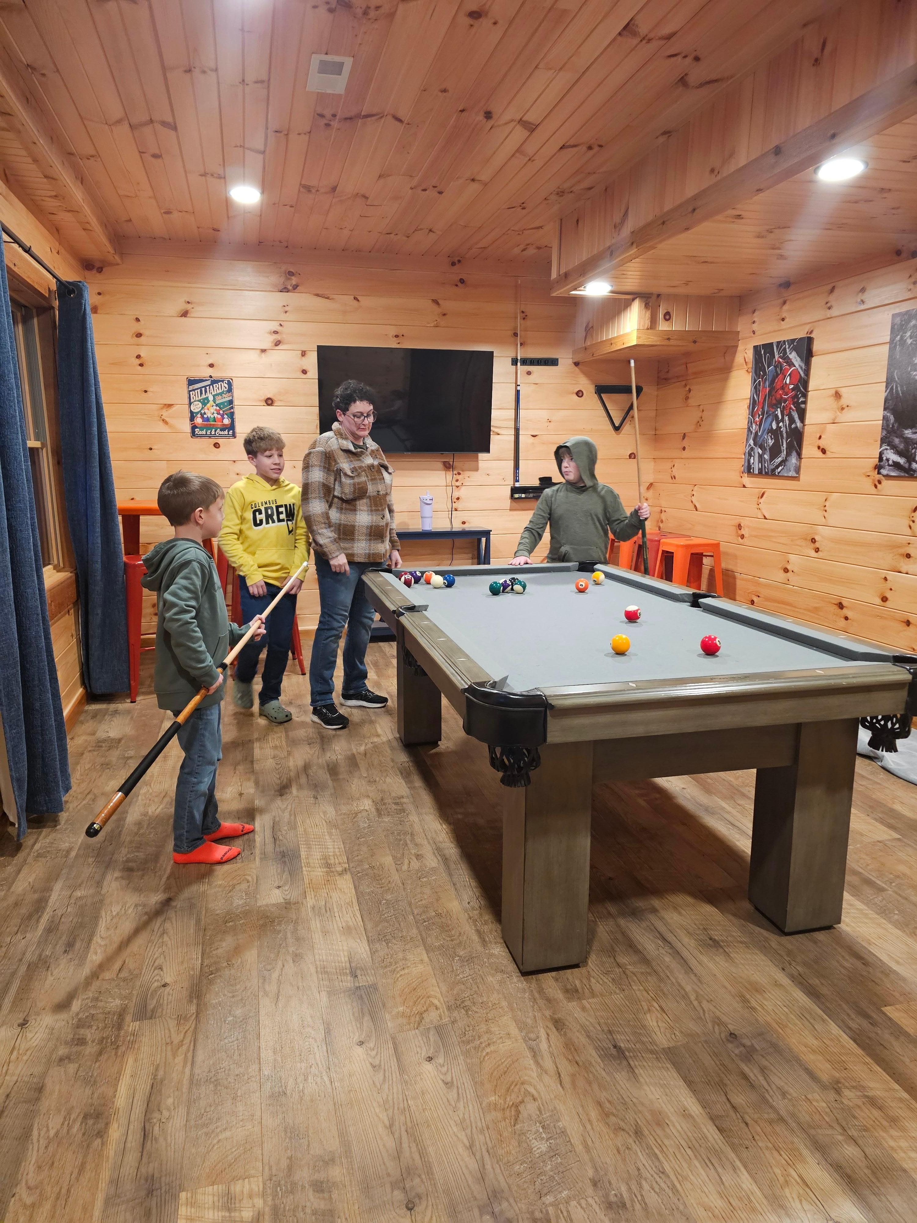 Rec room with pool table, arcade game, flat screen tv (satellite connection), walkout hot tub deck access
