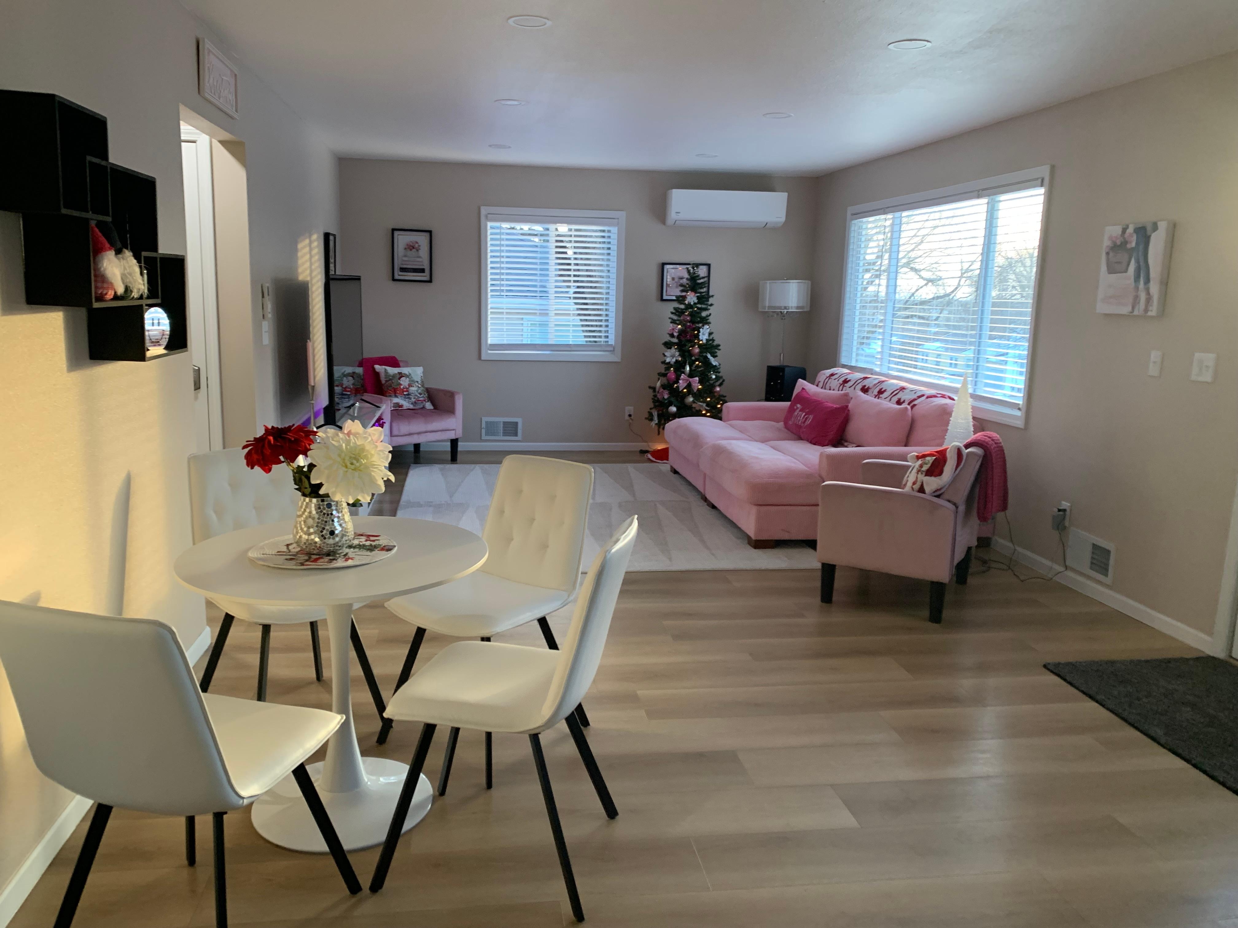 Welcome to Pretty in Pink in Bismarckâa newly remodeled upper-level duplex with 2 bedrooms and 2 bathrooms. Enjoy a cozy living room with a fireplace and Smart TV, a fully equipped kitchen, and a dedicated workspace with high-speed Wi-Fi. Both bedrooms feature king beds and access to a private deck. With modern amenities, in-unit laundry, and keyless entry, itâs perfect for business trips, family getaways, or relaxing retreats.