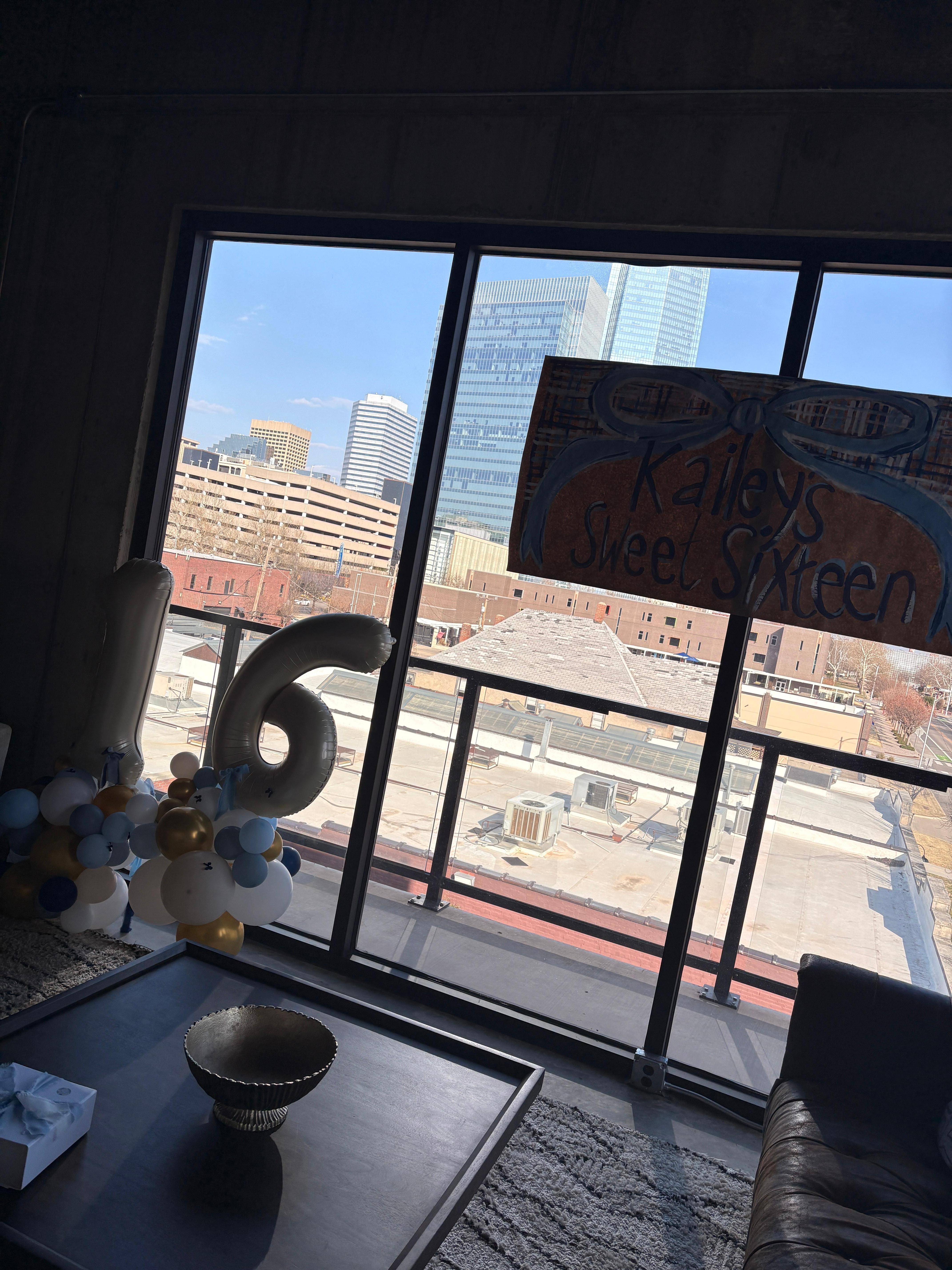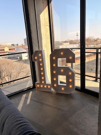 * Floor-to-ceiling windows with stunning downtown views