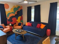 --Living Room: Queen Sleeper Sofa + Ceiling Fan