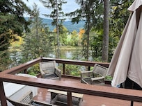 The back deck affords a spectacular view of the McKenzie River. Watch boats drift by all summer long and watch the wisps of mountain fog each morning during the winter. Salmon can be seen spawning in a gravel bed in September, and bald eagles and osprey are nesting in the forest behind the house. The property includes access to Alder Creek, which has a trail to a small waterfall accessible from the back deck.