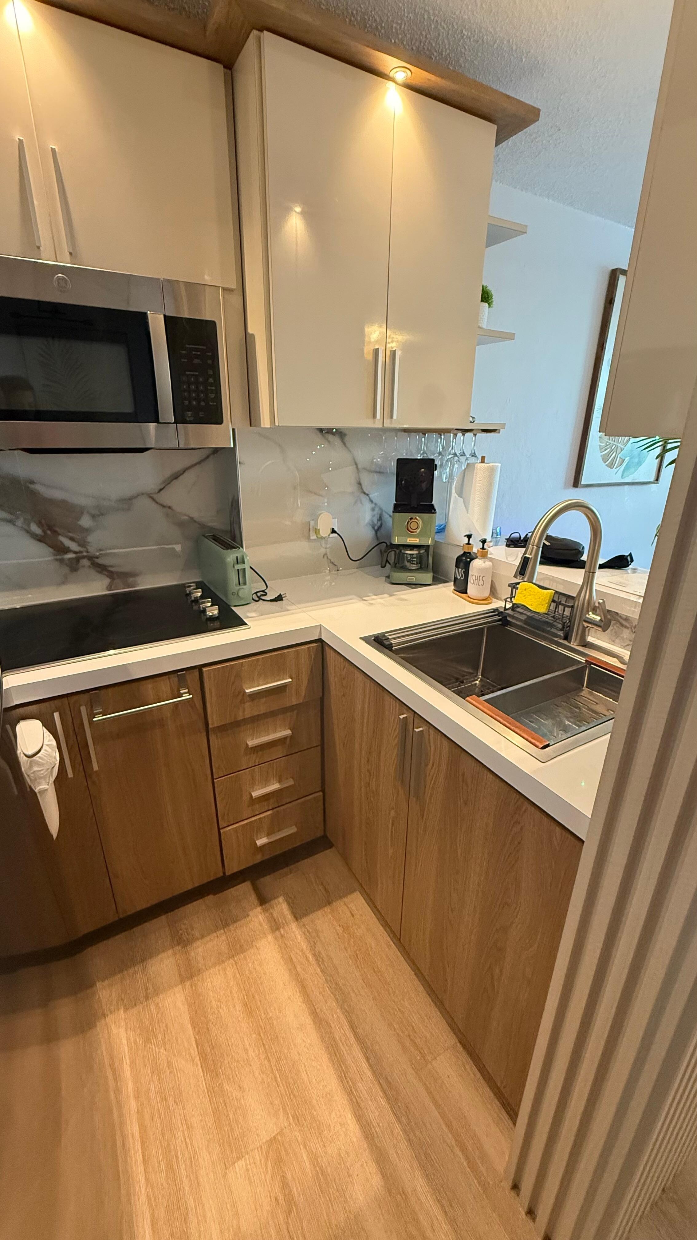 Modern Kitchen: Fully equipped with everything you need to prepare meals and save on dining out! Includes full-size appliances, cookware, dishes, coffee maker, and gorgeous marble-look backsplash with under-cabinet lighting.