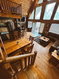 à l'intérieur - Un foyer électrique en pierre à couper le souffle, 2 chambres et 2 salles de bain, lit queen en bois de cÚdre Amish et lits superposés avec matelas Tempur-Pedic, fauteuil et pouf sectionnel et exécutif en cuir Flexsteel, table de salle à manger et chaises en cÚdre Amish pour 8 personnes, comptoirs de cuisine et bar en granit noir avec 4 tabourets de bar en bois Amish, électroménagers en acier inoxydable, laveuse et sécheuse haut de gamme, TV HD 60 pouces avec Roku, Youtube Live & Netflix, lit king size Master Suite avec balcon, TV HD 50 pouces avec Roku, Youtube Live & Netflix, loft avec lit de repos et lit gigogne, un systÚme de jeu Mame Arcade unique en son genre, une grande salle de bain complÚte, et bien sûr, nous avons un accÚs Internet haut débit par fibre optique avec un routeur sans fil ...... et c'est seulement ce qu'il y a à l'intérieur.