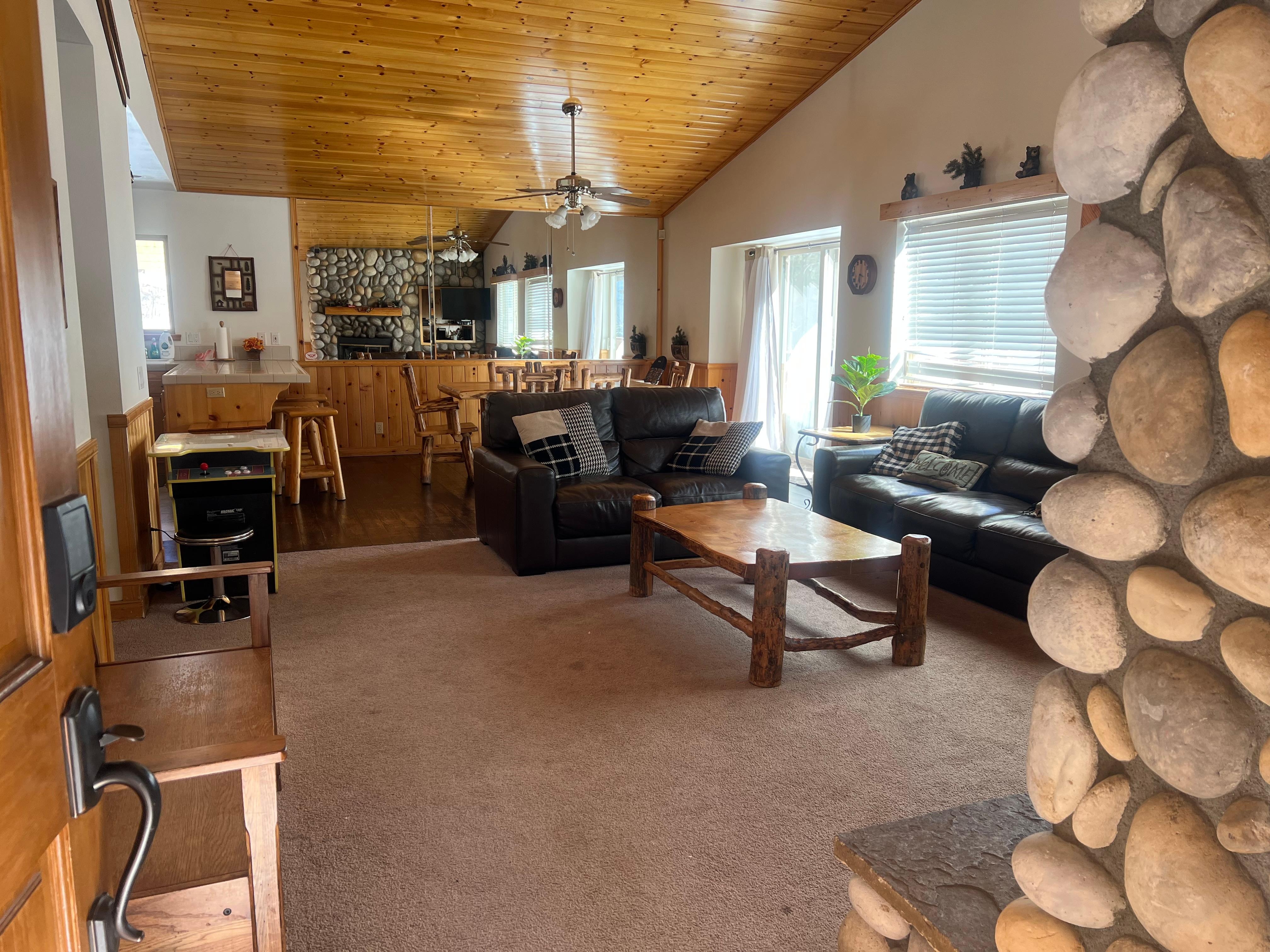 Let me first start off by saying location is everything, 5min drive behind the village but still far enough nestled in the mountains. We stayed with 3 kids, ages 14, 11 and 7, there was something to do for each one of them. Hiking the trails that are literally located in the back yard and up the street from the home. Climb up far enough and you can enjoy the beautiful view of Big Bear Lake and the Breathtaking views of GODs green earth! Jacuzzi to help sooth your muscles that were used to climb the mountains. Video game (Ms. PAC-Man and others) that us adults and children played while waiting for dinner. Enjoy quietness and the chirping of the birds while you eat outside on the deck located from the kitchen. Perfect size kitchen for someone you loves to cook, with utensils and cookware you need! Bring cooking oil and spices. Stater bros, Vons, and Dollar Tree are a 10 min drive. The bedrooms and living room have flat screen TVs. For a mom of 3, itâs a plus to have a washer and dryer located inside the house. The owner makes sure to let you know ahead of time if you are having any kind of issues to just reach out to him and he will send someone to be there right away to assist! So there is no reason not to reach out if you are in need of assistance! The home looks like a 2 story house but looks are deceiving because everything from the kitchen, living room, laundry, master bedroom and the other 2 rooms are located on the same floor which is great for a mother that needs her children close by. Not sure if we even had next door neighbors because we didnât see them at all during our stay! We did say hello to our front neighbors which were really nice! I would most definitely stay in the beautiful home again!