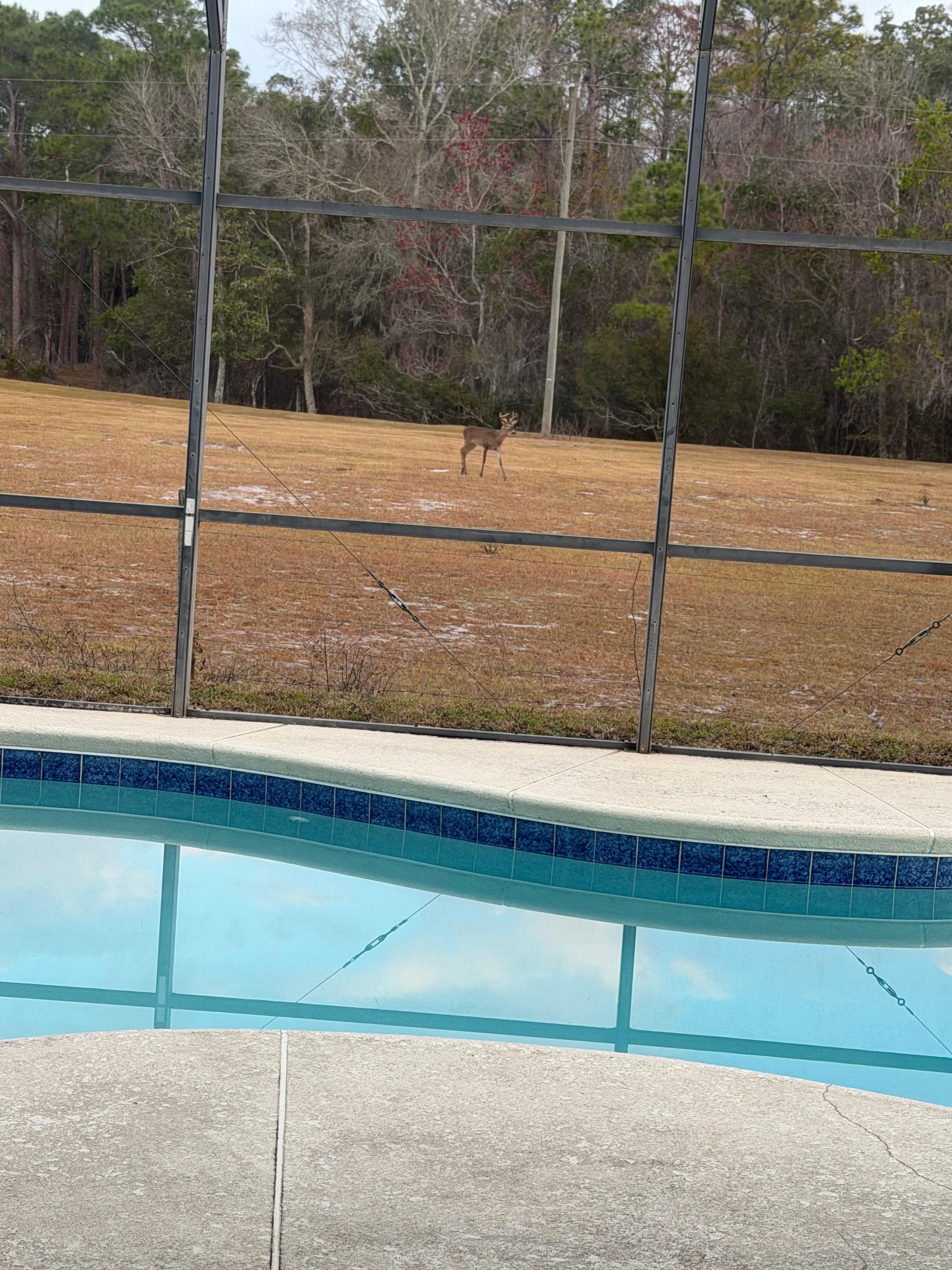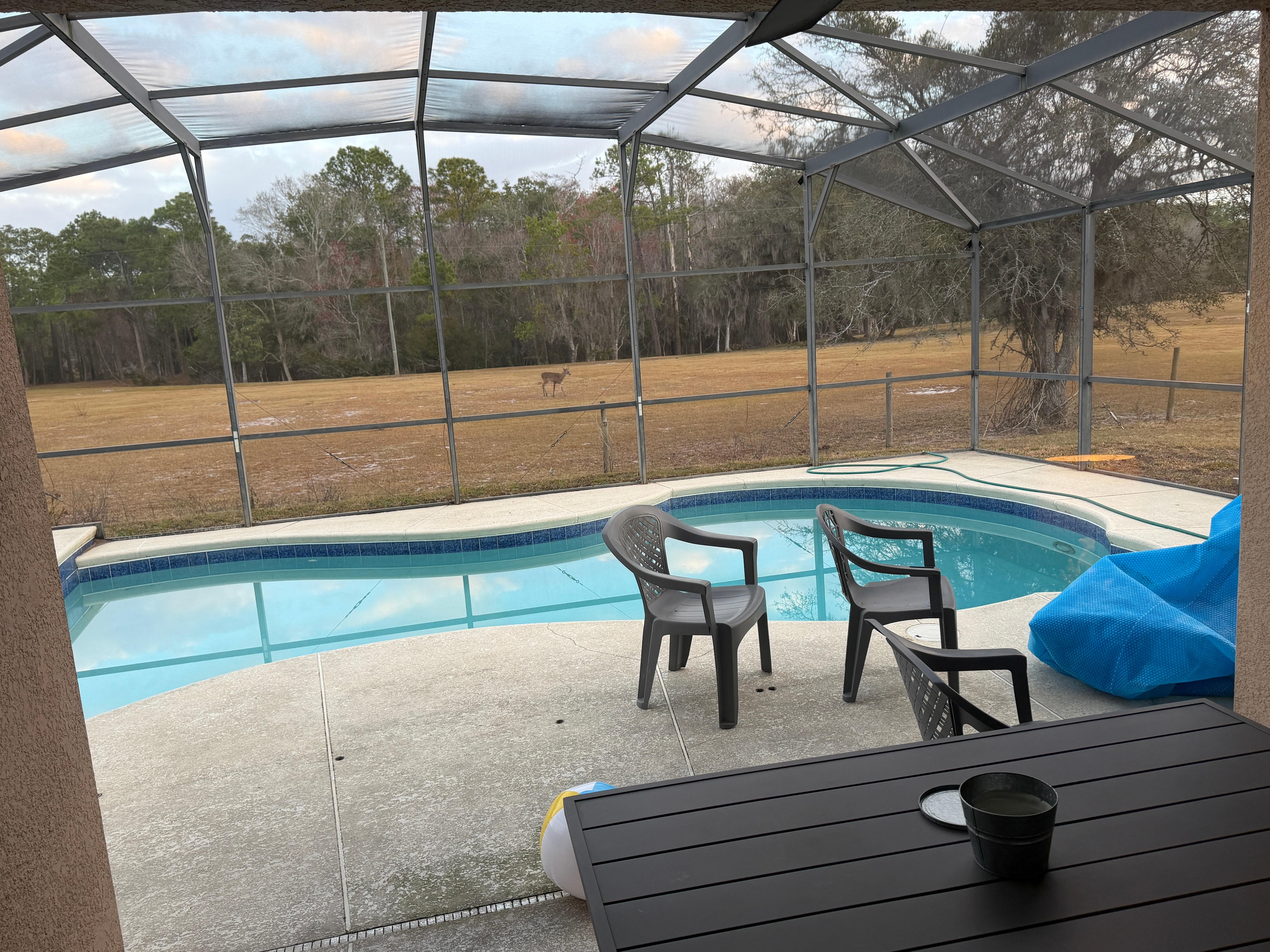 House was clean, pool area was adequate but smaller than it appeared in pics. Location was ok, at the end of a cul de sac which was nice to be at the end because the houses are very close together. The drive to Disney is right at 20 minutes. There is a nearby train visible from the house but it was not disturbing at all from inside. The neighborhood is congested and the neighbor literally had a toilet outside between the two houses, not giving a great first impression. Overall we enjoyed our stay. It is important to note that the field of horses also has cattle. It did not stink or smell at all. I chose this house mainly because my daughter loves horses and the first day I was upset because there were just cows, however on day 2 we did see the horses. There is a shared bathroom near 2 bedrooms where I had my children stay, this bathroom also leads out to the pool lanai area. The door that leads outside is glass, we had to put a sheet over that door so that the people on the lanai could not see the people using the bathroom. That was my biggest issue. The sliders that lead to the lanai from the living room comes off track very easily if you donât open and close it quite slowly. The home was sufficiently stocked but I wouldnât say well stocked.. please take extra trash bags, dish detergent, paper towels, etc. This house was adequate if you know what to expect. We enjoyed the pool and hot tub area.