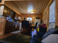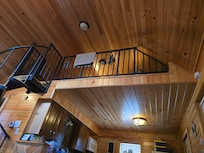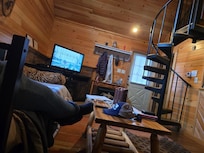 Tin roof is wonderful to listen to when its raining and the complete pine interior, with bamboo hard wood flooring and tile bathroom and shower give a very comfortable and homey feel. Sit in front of the fireplace with a glass of wine or beer and talk over the days events before cooking a nice dinner on the outside grill before retiring in the loft for a restful nights sleep.