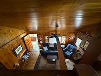 En parcourant le porche 3 saisons, vous découvrirez le magnifique intérieur en pin noueux et les planchers de bois franc réalisés qui font vraiment ressortir ce chalet. Les plafonds voûtés et le loft ouvert donnent au salon meublé avec goût une atmosphÚre chaleureuse et accueillante. Accentuant la piÚce est une belle cheminée à bois pour vous permettre de vous détendre à cÎté de ces nuits fraßches.