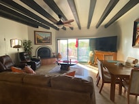 INDOOR LIVING: 2 Smart TVs w/ Cox cable (65" & 50"), Roku w/ Netflix, Amazon Prime & HBO, desk, fireplace w/ electric log and heater (no fires allowed), dining table, air purifier