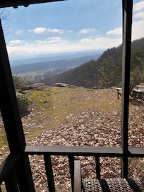 OUTDOOR LIVING: Screened-in porch w/ seating & valley views, private yard, charcoal grill, Adirondack chairs, bench swing, wildlife watching
