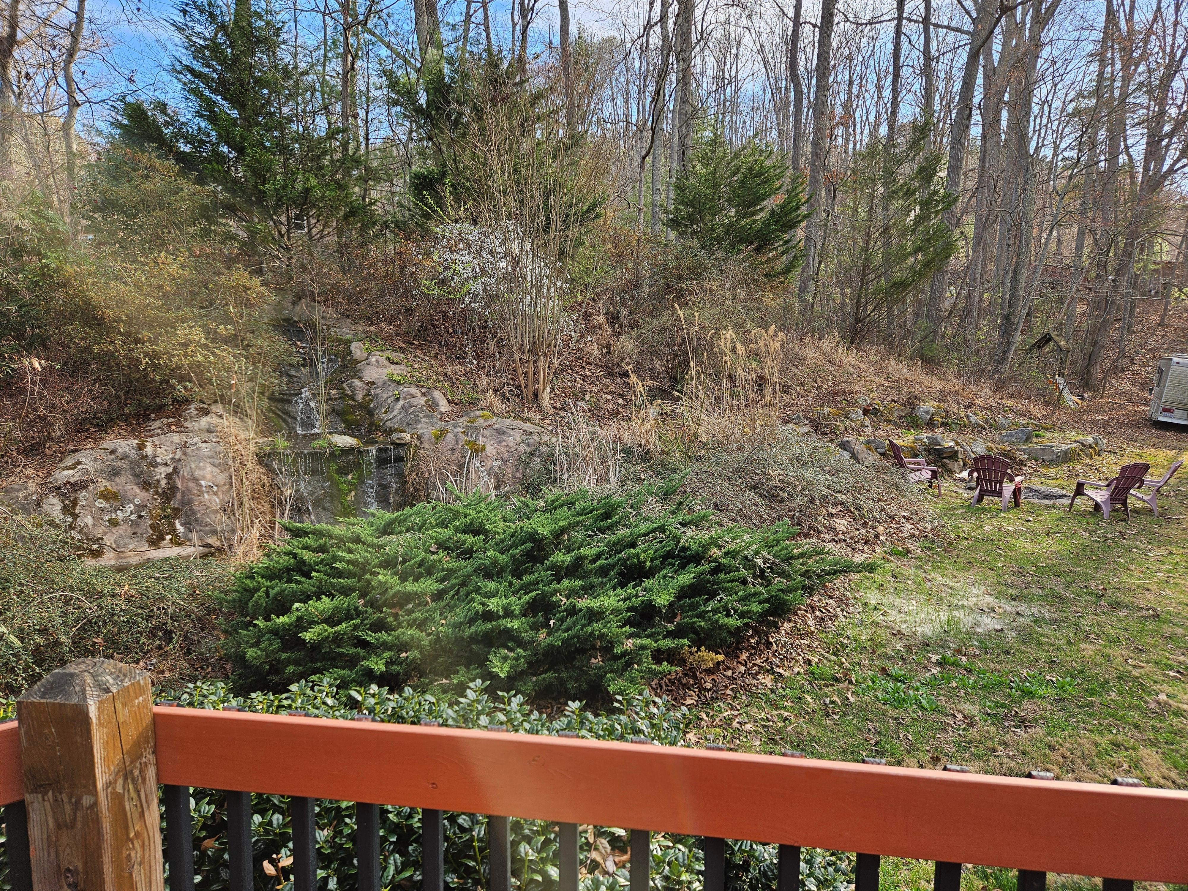 Le pont arriÚre a un coin salon avec une pergola recouverte de glycines pour l'ombre. Sous la pergola ombragée se trouve un patio extérieur avec un canapé, deux chaises et une table pour se détendre et lire un livre. De l'autre cÎté du pont, il y a une table de patio qui a 4 chaises avec un parapluie. Les deux tables ont vue sur l'étang et la cascade. C'est agréable de s'asseoir là la nuit et d'écouter les grenouilles et les insectes coassant et bourdonnant en arriÚre-plan.