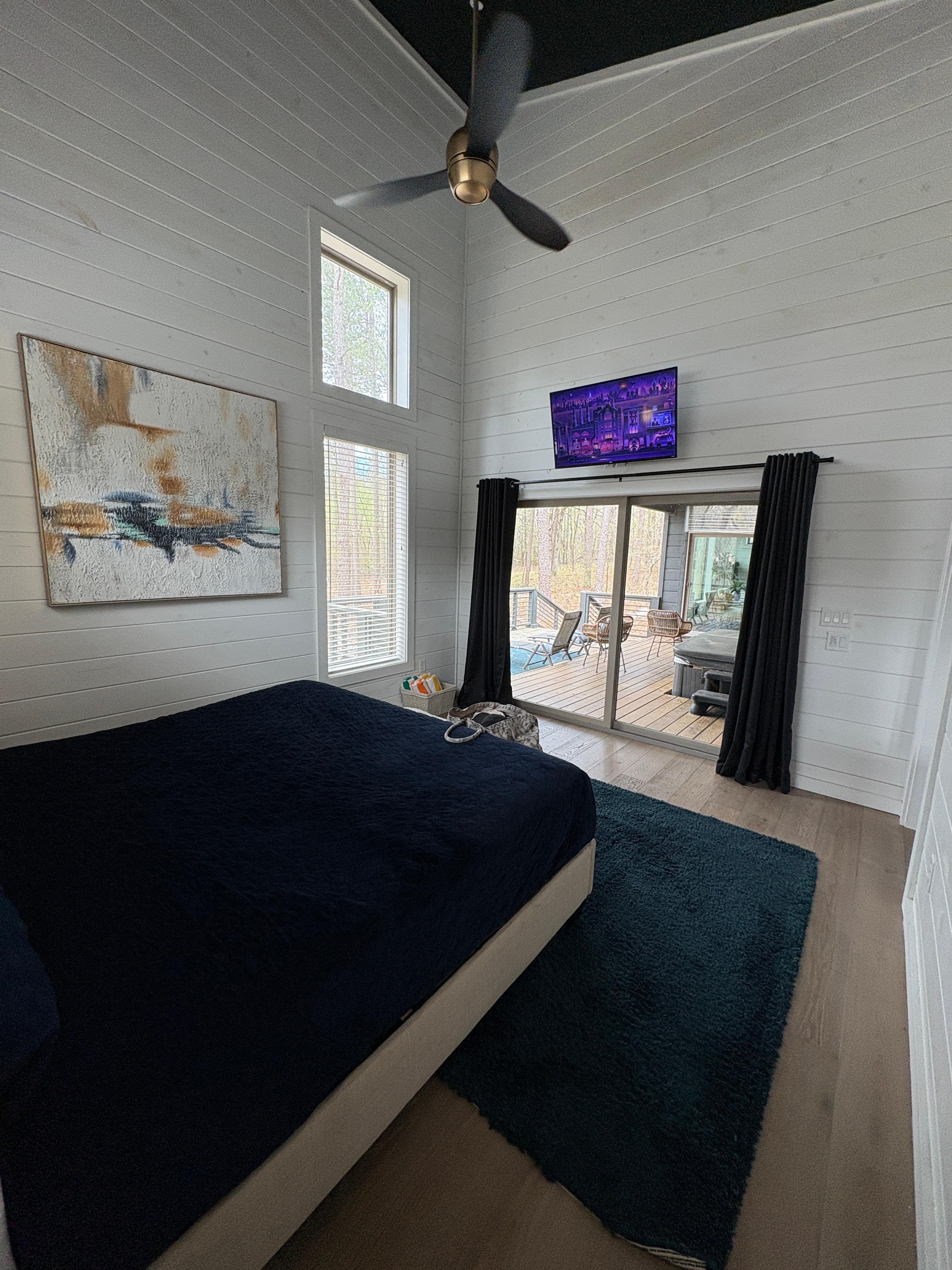 Through a 6 ft sliding glass door from the living room, you enter an oasis like no other. Encased in beautiful opulent tile from floor to ceiling, the gorgeous spa-like bathroom will not disappoint. The first feature you encounter is the unique round 5’ soaking tub. Lit from above by a crystal chandelier, this tub will invite you to spend some quality time just relaxing to soft music or a good book. The huge walk-in shower has two shower heads as well as a hand-held shower, again encasing you in high-end tile work that is a visual work of art. A double vanity with a touch-activated 5 ft back-lit mirror will ensure that no sharing is needed when it is time to get ready to go and enjoy all that Hollywood Regency, Sweet Serenity, and Hochatown have to offer! When it’s time to rest or catch up on your favorite tv program, the comfortable king-sized bed and soft linens will offer you a tranquil, restful night’s sleep surrounded by the quiet trees and the peaceful calm of nature