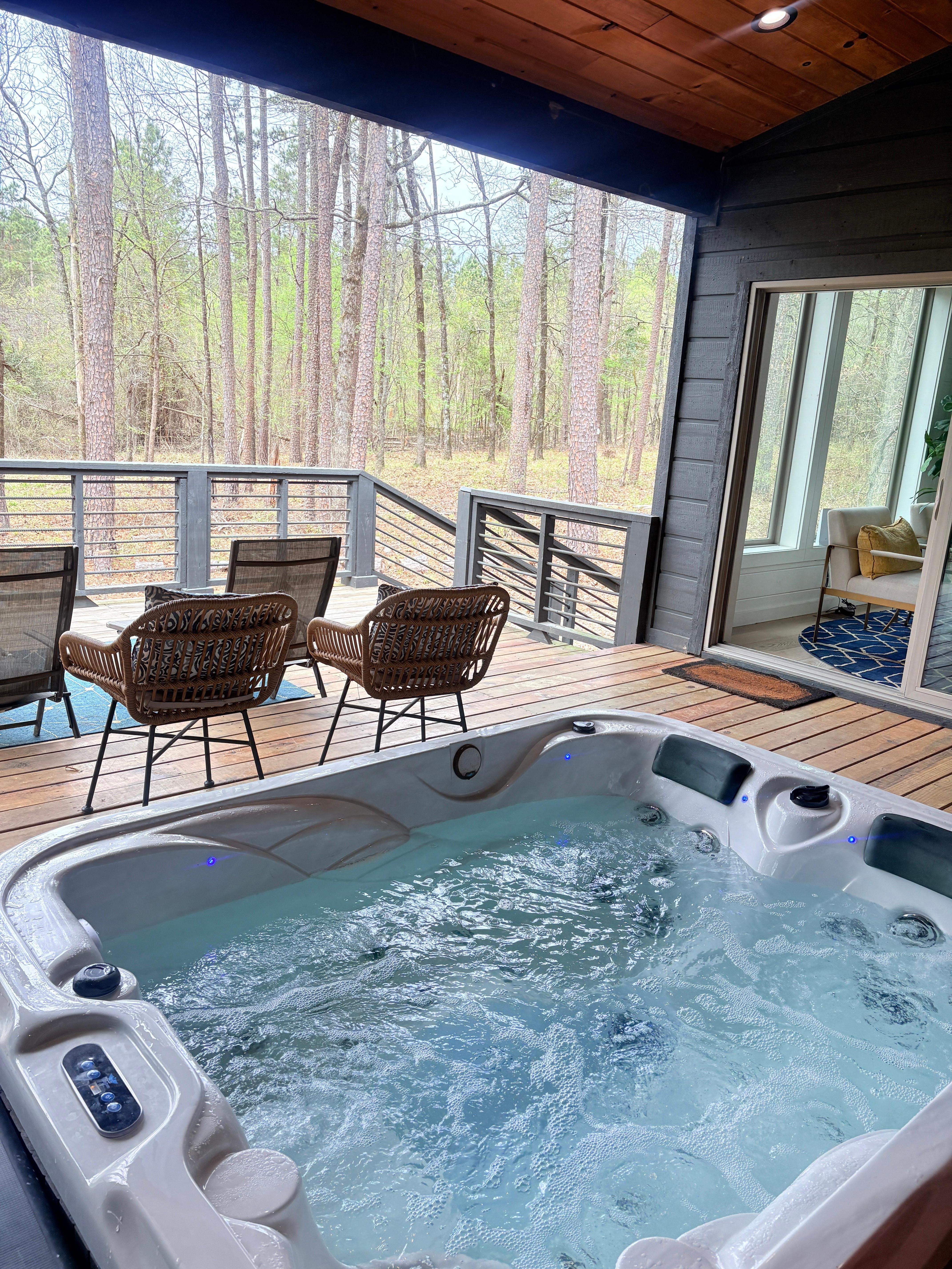 Leaving the cabin through the bedrooms 6 ft sliding glass doors into the natural forest that makes up Sweet Serenity Resort, you are able to take advantage of the cozy Dr. Wellness Tranquillity sunken hot tub equipped with two lounge seats, 31 jets, and blue tooth speakers. You can also enjoy the double-sided fireplace from the comfort of the hot tub while having a cocktail and recharging your soul. An open area sun deck equipped with two fully reclining sun chairs and a gas grill only add to the amenities you will enjoy during your stay at Hollywood Regency. Oh, and don’t forget the wood-burning fire pit and Adirondack chairs nestled within the landscape for enjoying those beautiful Oklahoma nights.