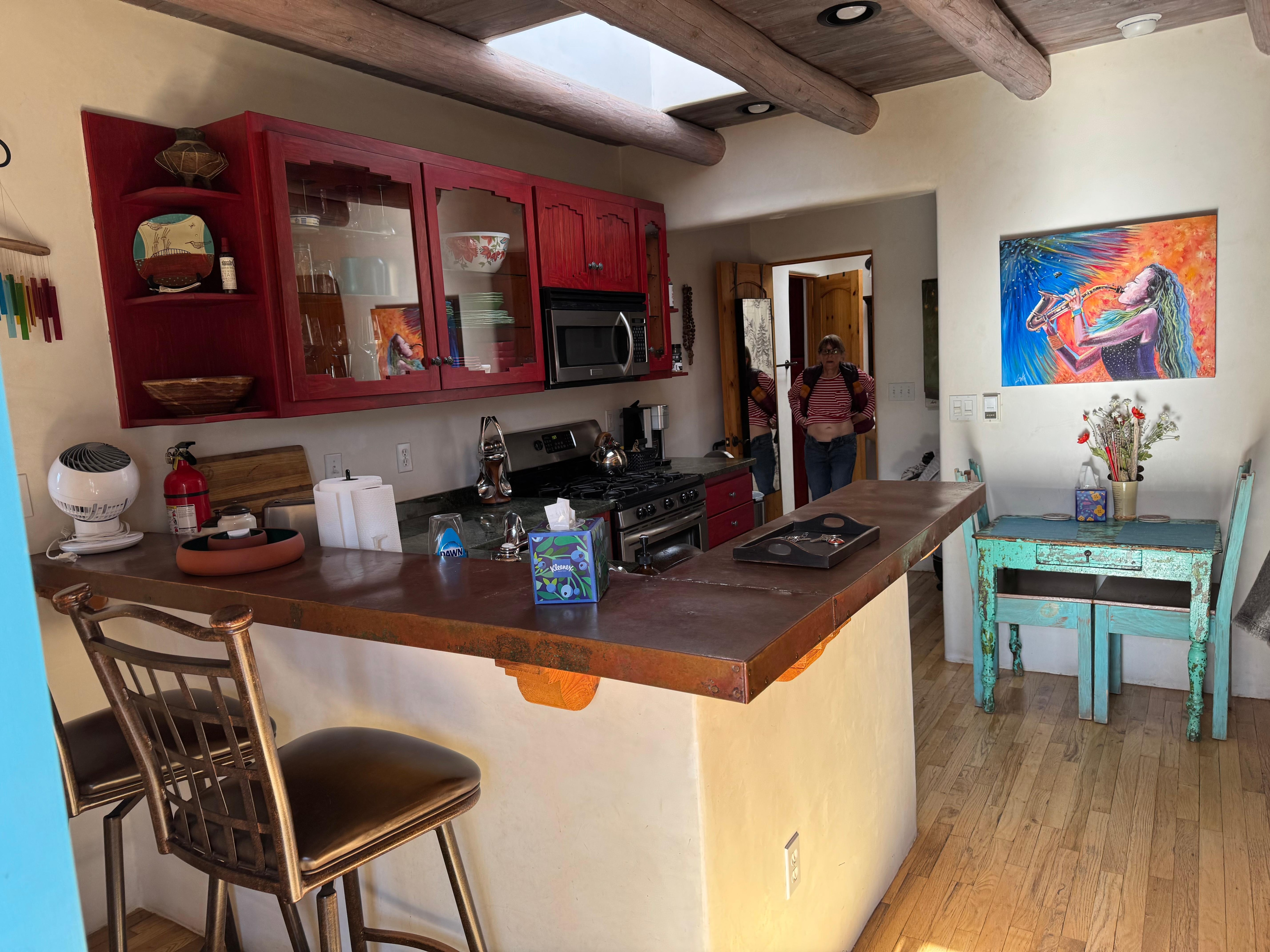 David a visité Taos pour la premiÚre fois en 1971 dans le cadre d'une bourse d'art à travers son université. Nous espérons que vous apprécierez ses peintures originales qui se trouvent dans la casita et sont disponibles à l'achat. Il expose également à la Natural Accents Gallery située au 103, Paseo del Pueblo Norte, Taos, NM. Carmelita, infirmiÚre retraitée à l'oncologie, apprécie l'expérience culinaire du Nouveau-Mexique et du Sud-Ouest, ainsi que la fabrication et le partage de sa spécialité, des friandises maison pour chiens.