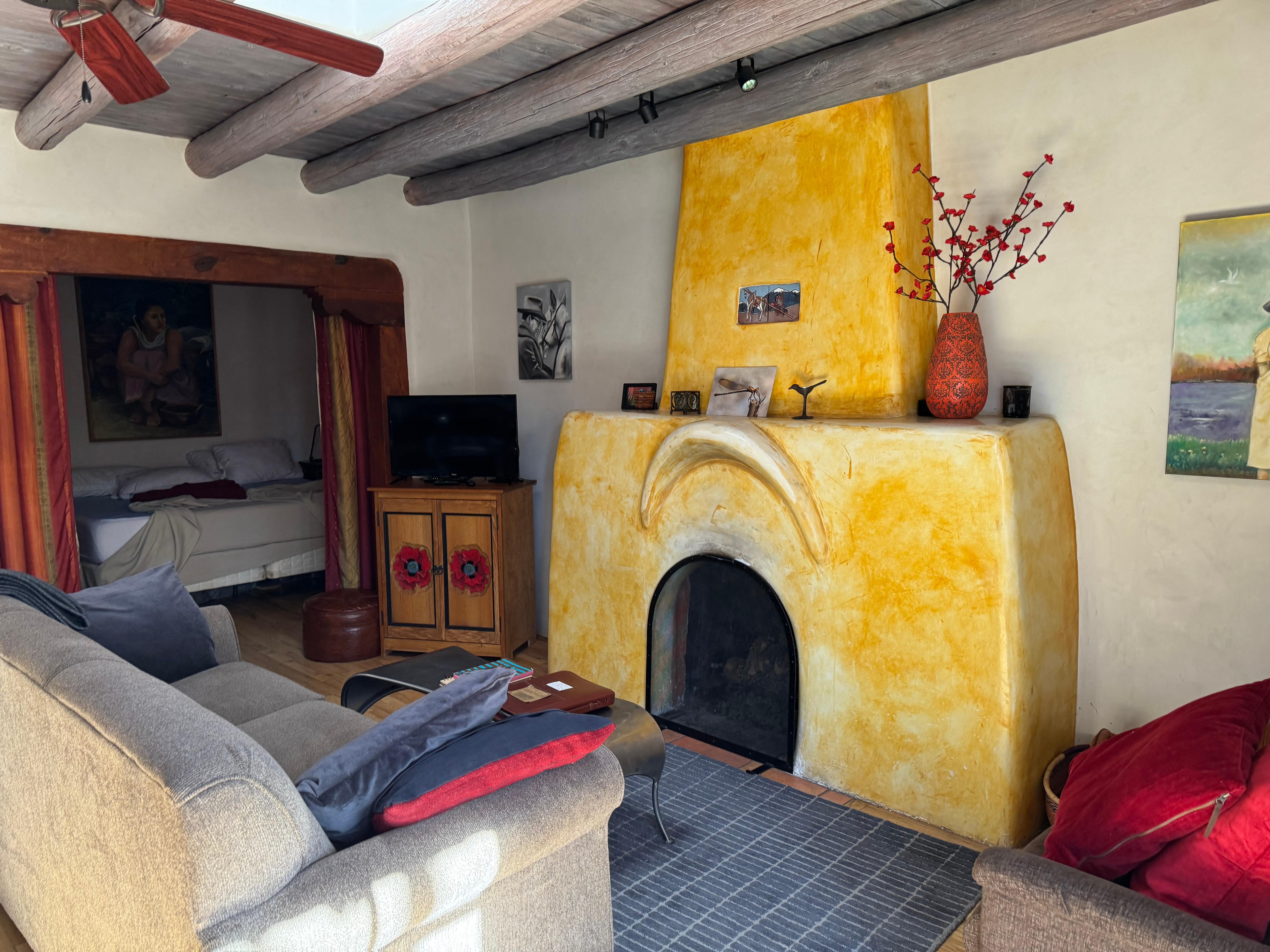 Casa Carmelita est une habitude classique d'adobe qui s'ouvre sur une zone commune herbeusement aménagée et herbeuse. Là , vous apprécierez un totem unique entouré de grands arbres de coton et de trembles. Ce gant d'une chambre peut accueillir 4 personnes confortablement avec un lit king (mousse à mémoire) et un canapé Queen, American Comfort Sleeper avec matelas à mousse à mémoire de premier rang, pas de barres, sans ressorts, sans compromis. Nous sommes des amoureux des chiens et sommes une casita amicale pour les chiens. Les invités apprécieront le grand foyer à bois Kiva pour les nuits chaudes et confortables. Les portes françaises s'ouvrent sur le spacieux patio privé présentant un ensemble de bistrot avec une chiminea à bois pour une heure heureuse "plutÎt", puis survolez la soirée avec un bain relaxant dans le bain à remous. Les équipements supplémentaires incluent cuisine entiÚrement équipée, laveuse et sécheuse, micro-ondes, lave-vaisselle, Roku / Smart TV avec écouteurs Sony sans fil, DVD Blu-ray, lecteur CD avec Bluetooth, Bluetooth portable pour la musique dans le patio, Internet haute vitesse par fibre optique, essence grill et une guitare pour votre plaisir musical.