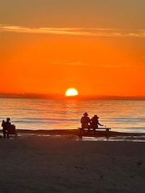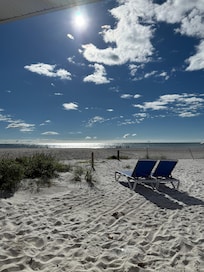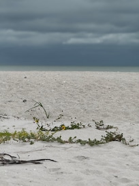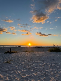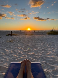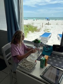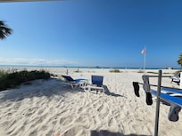 This property is so special because it is quaint, old Florida style and located directly on the beach - ranch style with NO STAIRS and a covered parking space 10 feet from your door, so that you can literally have your suitcase in your bedroom and on the beach in 10 minutes! We love this location on the beach because it is more private and the ocean is so clear and turquoise blue/green! We have updated the kitchen/living room to make it an open floor plan with white shaker cabinets, a full-size stainless steel appliance package and granite counters and breakfast bar. The bathroom is also totally remodeled with a walk-in shower and comfort height toilet. All off the furniture, bedding, kitchen accessories, etc. are brand new - as well as 2 flat screen TV's (ROKU in living room and Alexa) and high-speed wireless internet. You will love watching the sunset from the covered front porch or inside at the kitchen table - or start the day with a cup of coffee from either place!