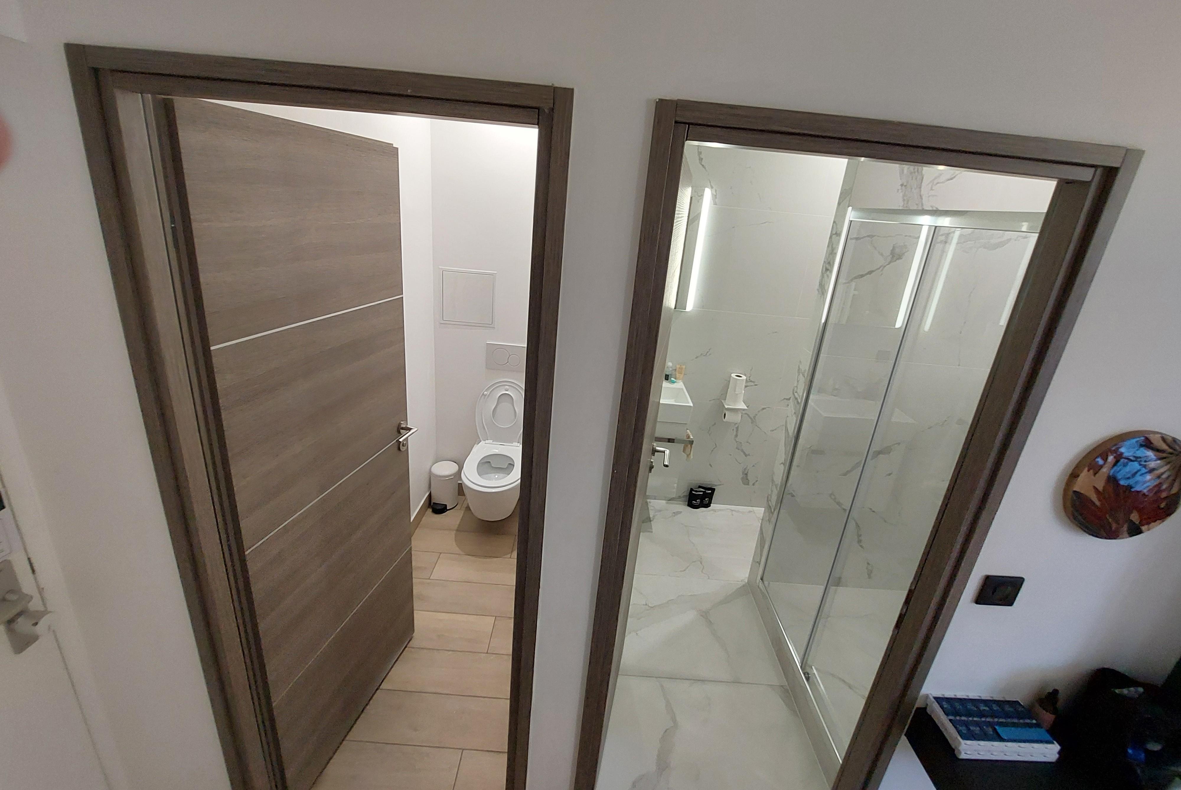 There are two modern bathrooms in the apartment, each equipped with a shower. One of them includes a toilet, offering real comfort for everyday use. There is also a separate toilet.