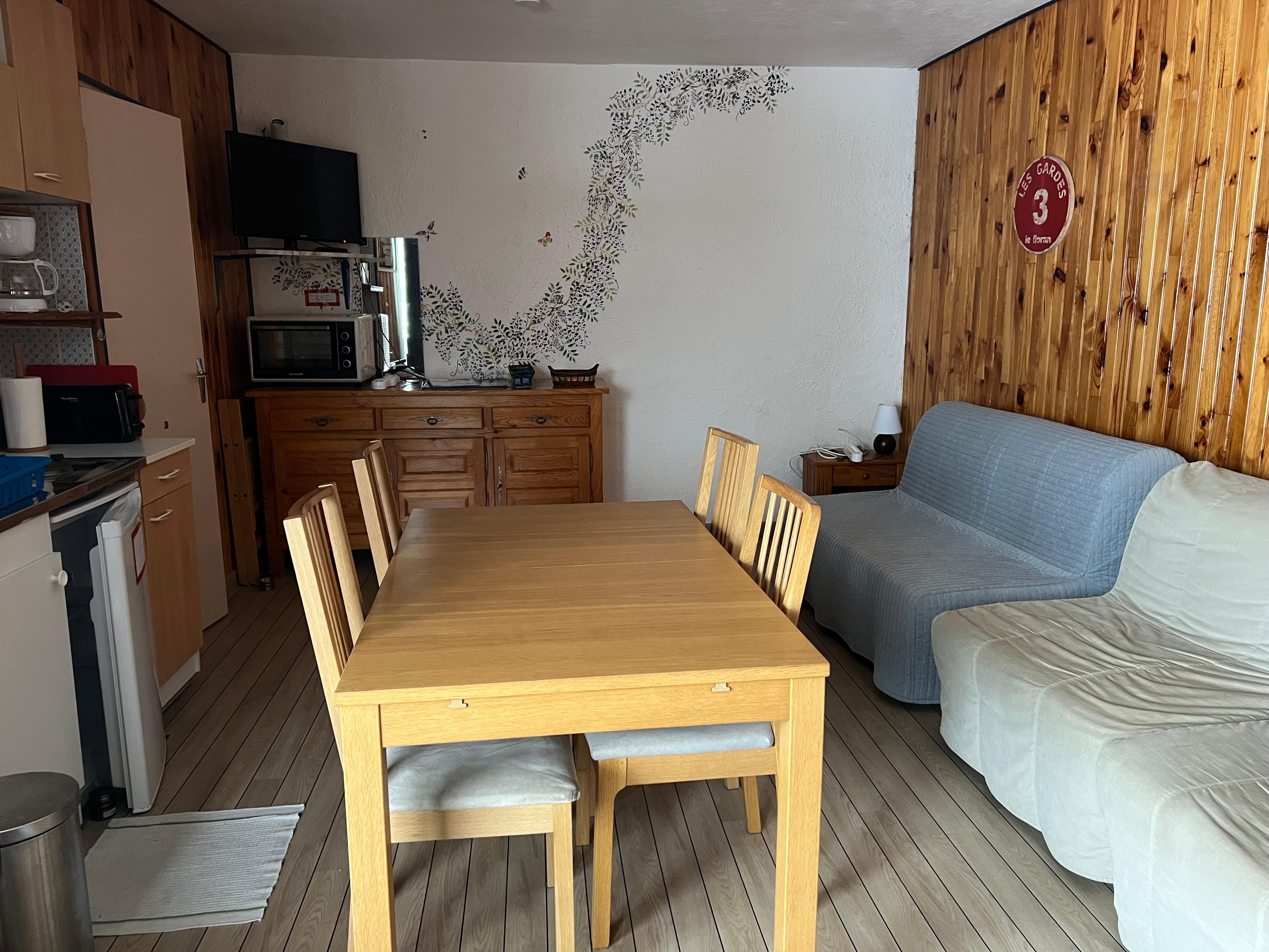 Le Lioran駅に位置し、リビングエリア、キッチン、ゲレンデを望むバルコニー付きの6人用家具付きアパート。 ソファベッド(2名様)、暖炉サイドチェア2脚、二段ベッド2台を備えています。