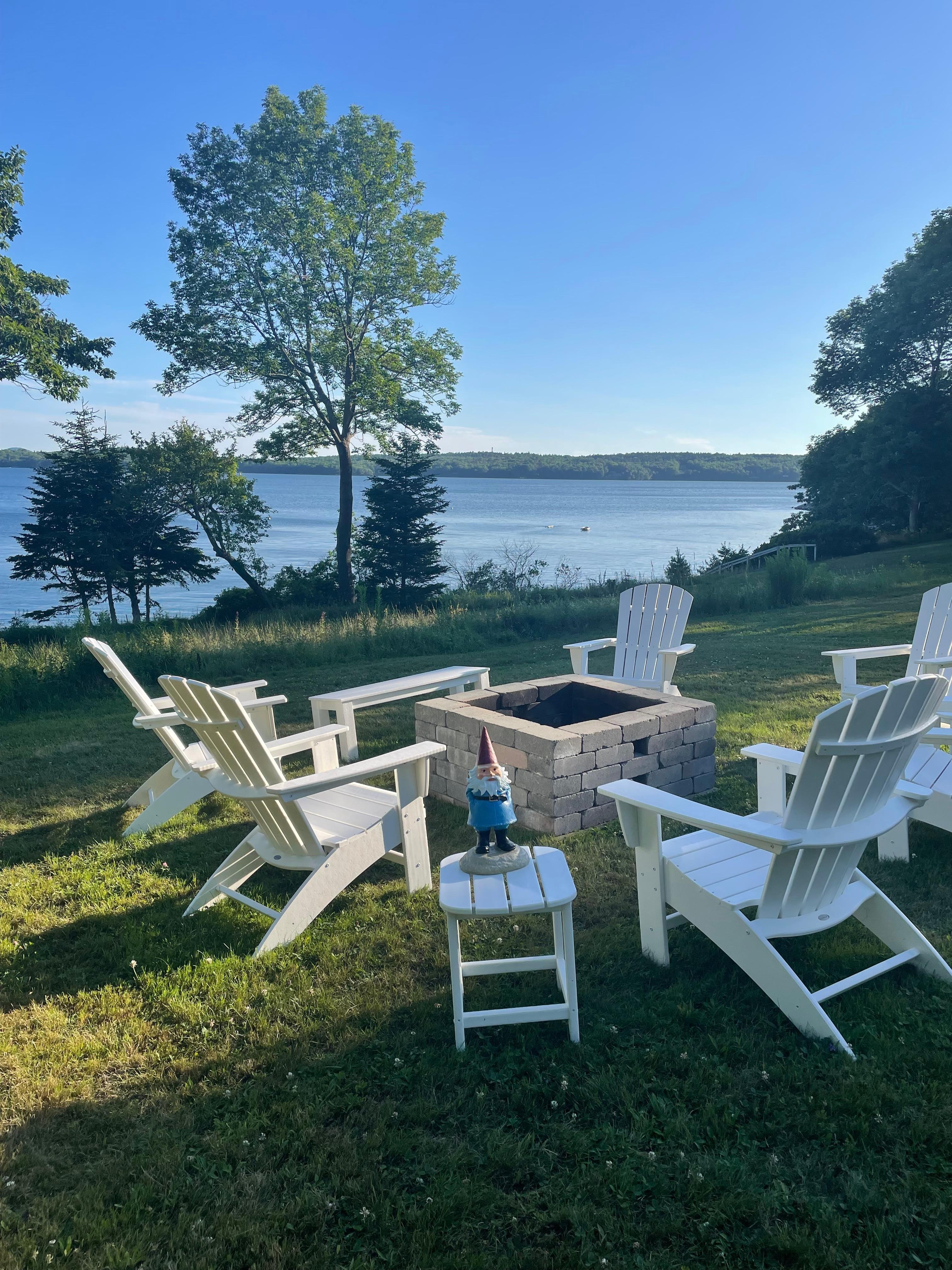 * Outdoor Living: Waterfront with private shore access and mooring buoy, covered porch, gas grill, fire pit (firewood and roasting sticks provided), large yard with yard games.