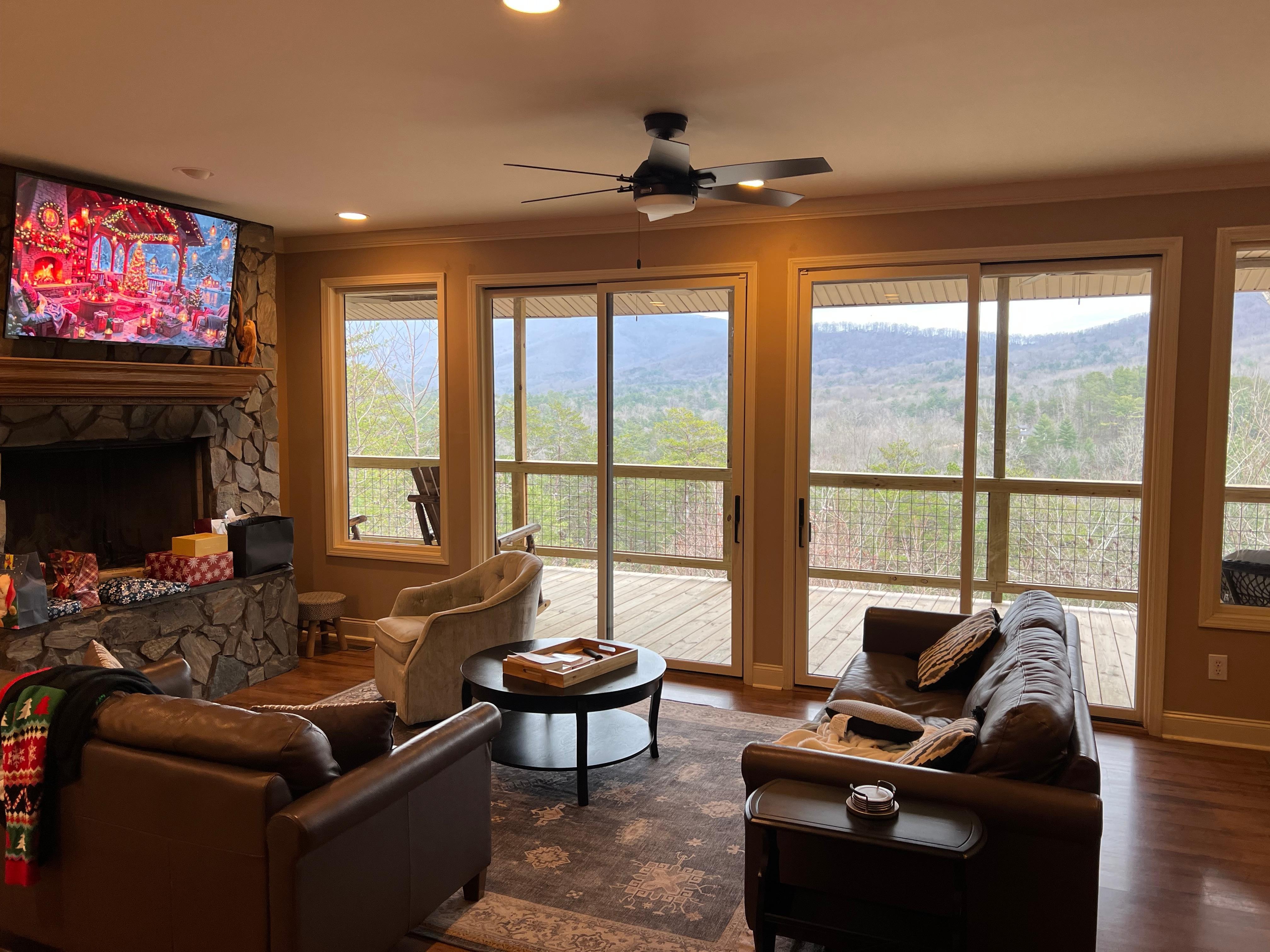 Sunrise Ridge is a gorgeous mountain home with amazing sunrise and mountain views that can be enjoyed from almost every room in the house! The great room has a ceiling to floor wall of glass allowing you to enjoy the views regardless of the weather. The huge covered porch is where you will most likely find yourself hanging out a lot. Imagine yourself just relaxing, perhaps with someone special or enjoying some family time in the fresh mountain air relishing in these mountain views! Keep the camera handy, this is also the perfect spot to enjoy whitetail deer, turkey, hawks, eagles and yes, even black bear!