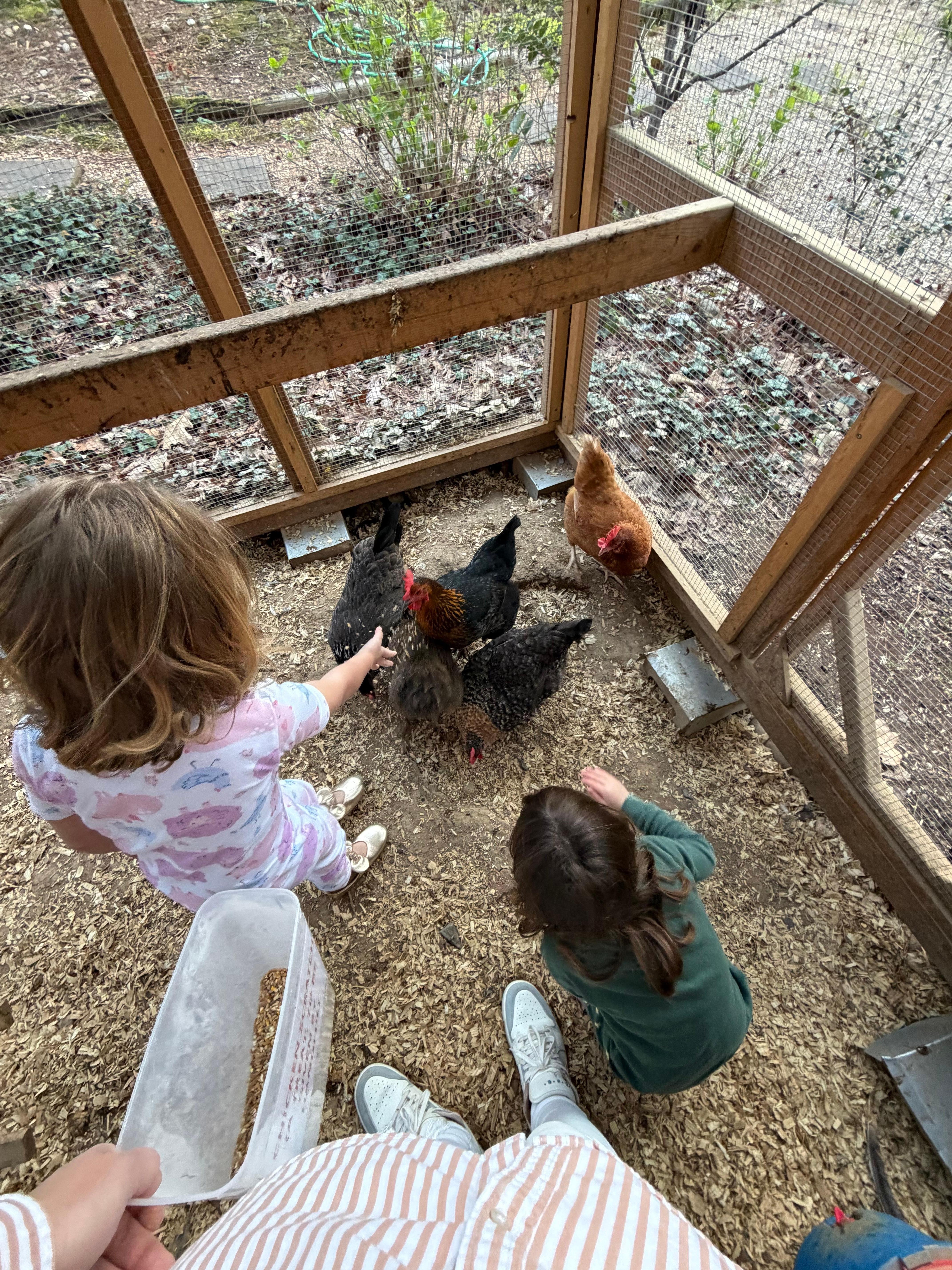What's better than having backyard chickens? Enjoying someone else's backyard chickens! Spend time feeding, playing or just hanging out with our girls. The large coop gives easy access to play with our friendly hens or if you prefer clean feet reach through the egg door to enjoy fresh eggs every morning! Leave the clean-up and maintenance to me! Don't like chickens? No problem. Leave them be and you won't even know they are there.