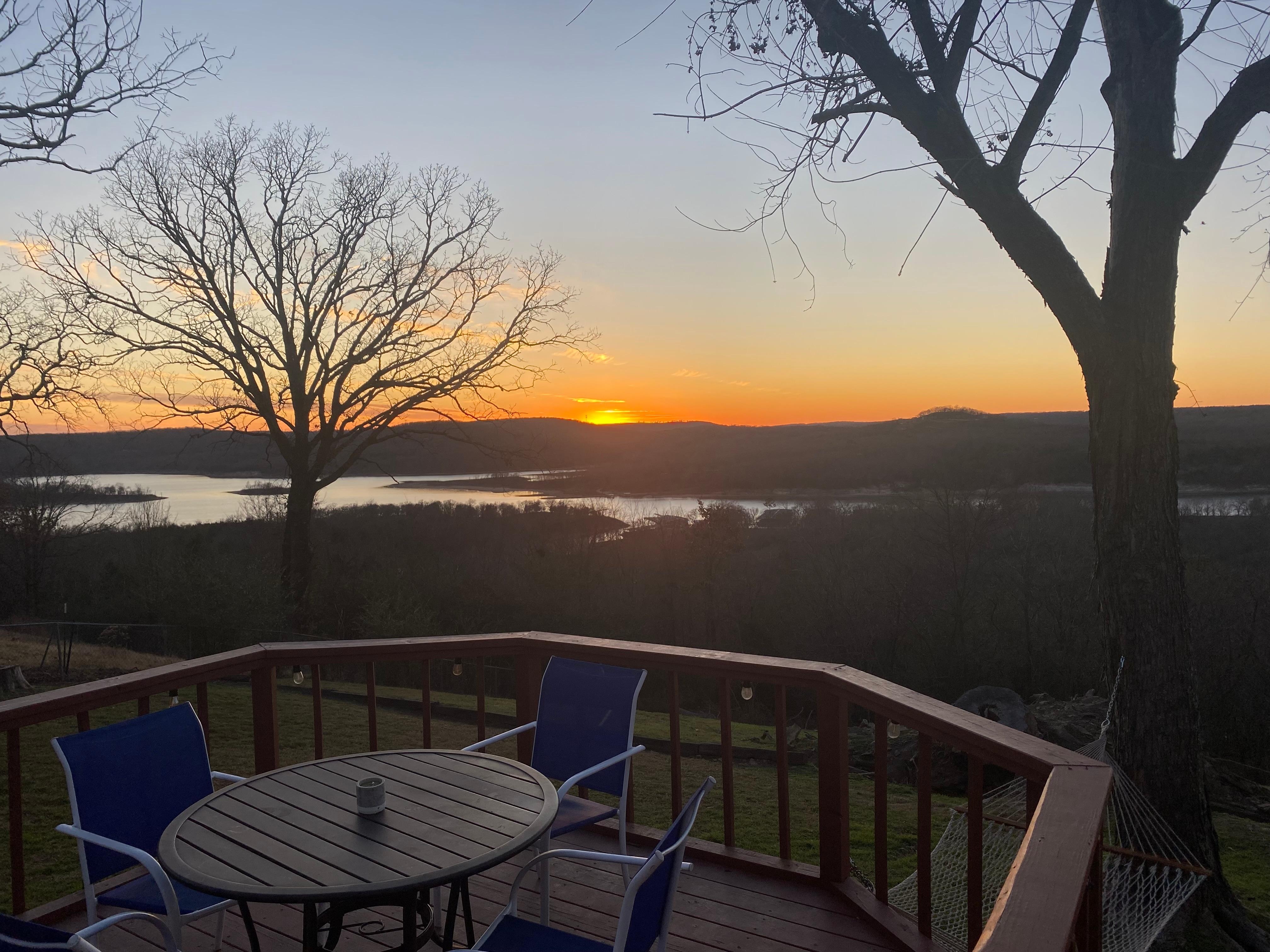 BEAUTIFUL LAKE VIEW RETREAT “SUNSET OASIS!” Enjoy magical evenings watching the gorgeous sunsets reflecting Lake Tenkiller at Sunset Oasis! Newly renovated and sits on top of Pettit Bay Mountain — Lake Tenkiller in the foothills of the Ozark’s. Perfect for romantic weekend getaways, family get togethers, bird (bluebirders) & wildlife observation, fishing trips, etc. Located less than a mile from entrance to Pettit Bay Recreation Area and the new Bluewater Bay Marina. NEW OWNERSHIP. Amazing view on top of PETTIT BAY MOUNTAIN! This spacious 2000 sq. ft. lake-view getaway open floor plan with two living areas and separate dining room is perfect for families and easily sleeps 10 with plenty of room to spare. The master bedroom suite with new linens & bedding has a queen-size bed, shower and soaker tub; the second bedroom has a queen-size bed and the third bedroom has two twin bunk beds. There are two queen-size pullout couches, one in the living room and the other in the family room. The dining area has a kitchen table that seats 8 with an additional 3 bar stools at the counter. There is plenty of room to set up the 6-foot folding table and chairs that are provided should you need additional seating. From the family room & kitchen you can view Lake Tenkiller and the amazing sunsets through the two large picture windows or you can venture out onto the 600 square ft deck to take in the beautiful views. The deck has two round tables with seating, two rocking chairs and additional lounging chairs in shed. Casey our property manager has the keys. Additional amenities include a fire pit, family games, a covered car port for your vehicles or boat and a small screened in porch to store your wet gear from a day on the water. New GRILL to enjoy delicious BBQ. Access to Lake Tenkiller is less than a mile away at Pettit Bay Recreation Area and Bluewater Bay Marina. Tahlequah is only 15 minutes away if you are looking for additional things to do or places to eat. If you love the outdoors, fishing, bird watching and wildlife and want to get away from the hustle and bustle of city living for a day or a month then this is the place for you.