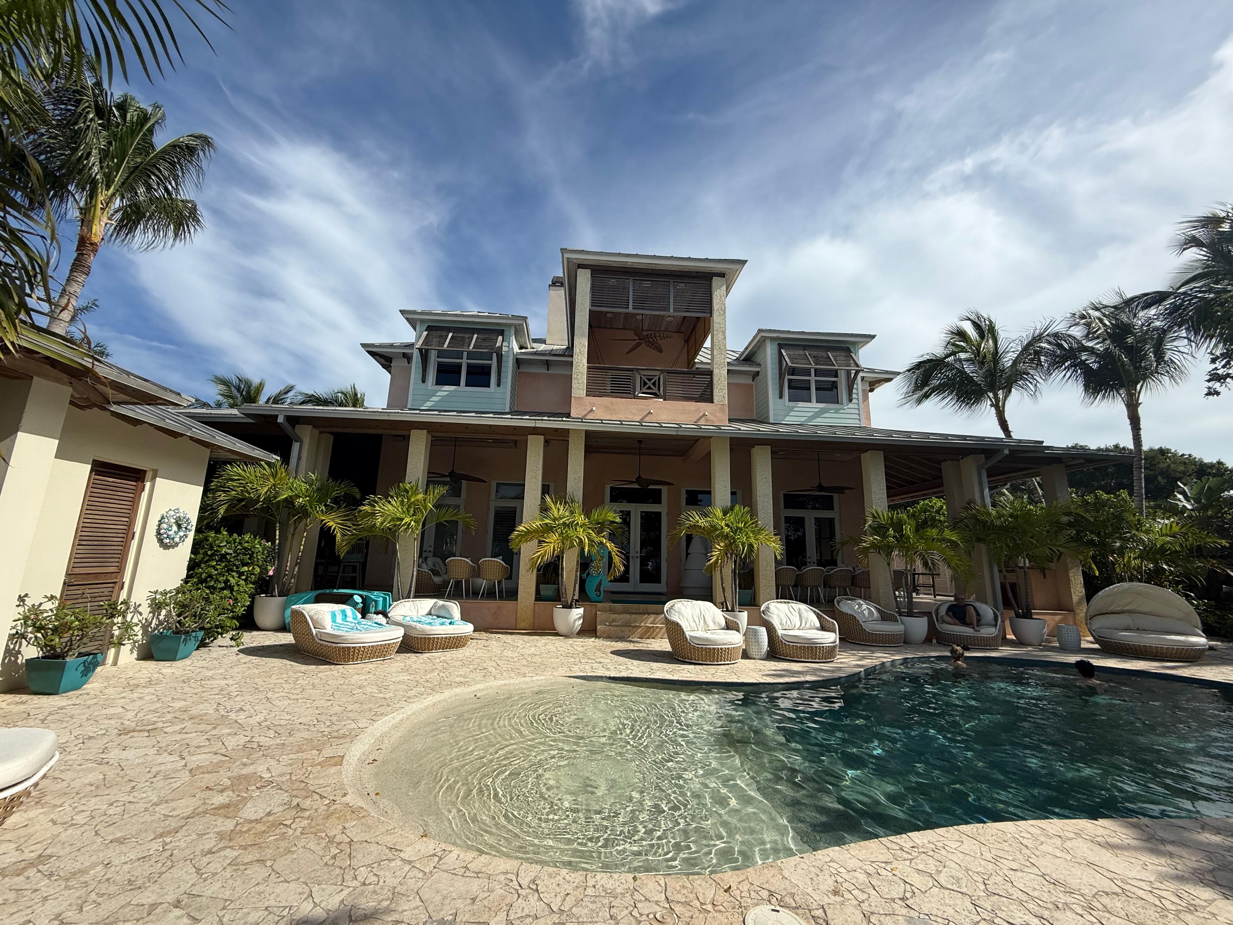 The home sleeps up to 14 guests with 5 full bathrooms, 1 half bath, plus an outdoor bath. There are 17 beds in total, but the villa accommodates up to 14 guests, giving guests flexible sleeping arrangements. With 2,500 sq. ft. of covered verandas and patios, this home is designed for indoor-outdoor living. Families are welcome — the villa is fully equipped with baby gear and toddler essentials, making it an IDEAL FAMILY-FRIENDLY BAHAMAS RENTAL.