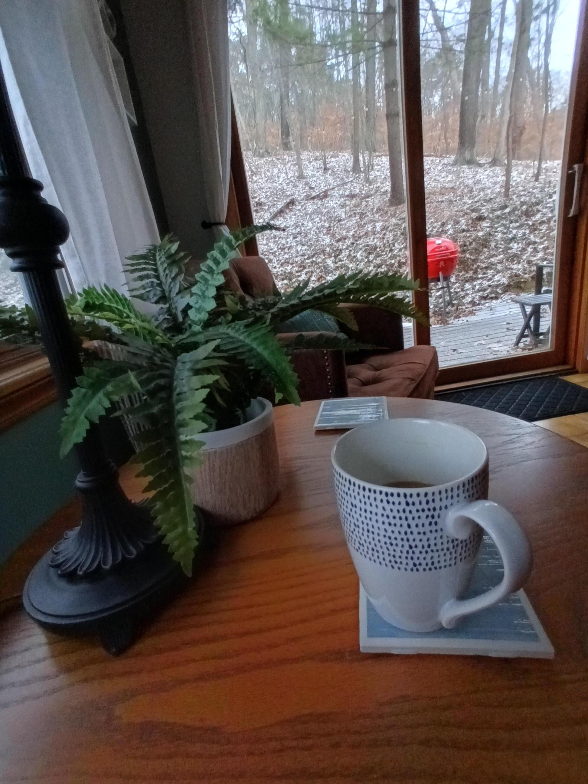 MAIN LEVEL: One level up (the main level) offers a large living room and dining room with 50” smart TV and an open kitchen with all you’ll need for meal prep including a pantry and well-equipped coffee & tea bar. A sitting area in the kitchen is the perfect spot for a cup of coffee or tea looking out into the woods. Panoramic views from the living and dining room are breathtaking. We also have a booster seat/high chair for a small child. Access to the decks, firepit and charcoal grill are on this main level. The full bathroom, also on this level, features a tub/shower combination.