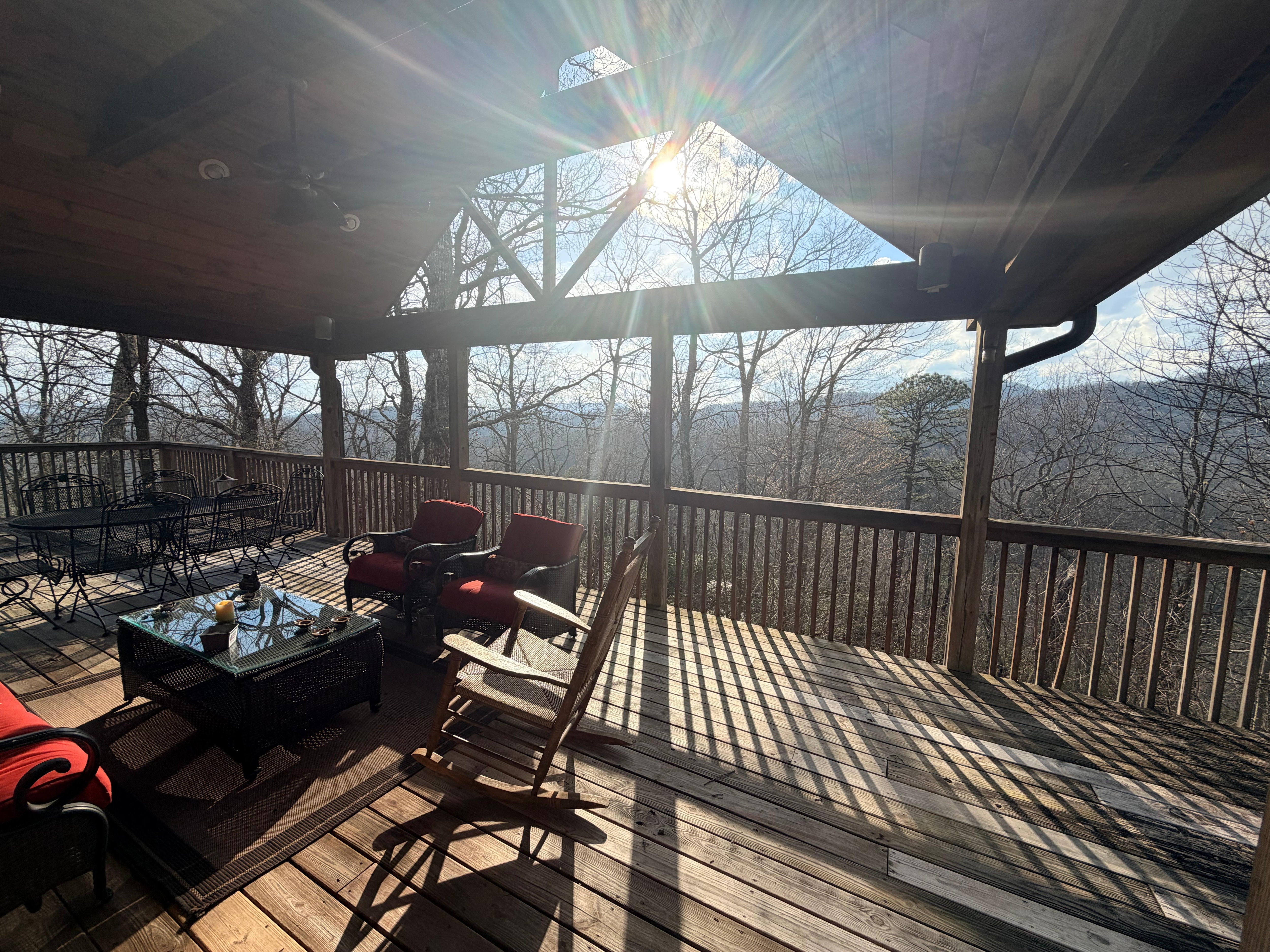 We enjoyed our week at this beautiful cabin. The porch is the best spot to sit to enjoy the fresh air, quiet, and trees all around (which are so thick, you can barely see the mountains beyond them - but this is the summertime!) It was like being in a treehouse. The cabin was immaculately clean, and we especially liked the large master bathroom which allowed us to spread our things out. The beds were comfortable, and the bedrooms and their accompanying baths are on opposite sides of the cabin- perfect for two couples, or in our case, privacy for both my husband and I, and our adult son. The kitchen was well-stocked with all the dishes you need. We did not cook, but I am sure you could find anything you needed to make a full meal. A highlight was seeing a momma deer and her fawn (twice!) One additional thing I loved was that it was perfectly quiet. I believe there is another cabin nearby, but if so, we could not see it, and heard nothing. I would highly recommend this cabin.