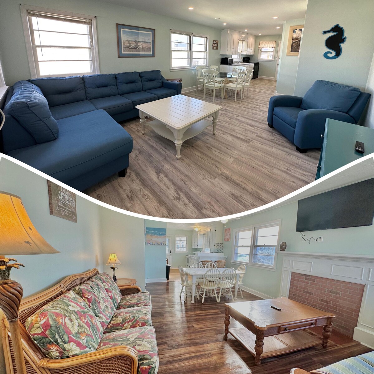 Multiple beds to comfortably sleep 14 people total. Fully stocked kitchens. TV & Cable & Internet access in both apartments. Each apartment has 2 covered porches, at the front & back, perfect for sitting back to enjoy the breeze & enjoy the warm summer sun! Only a short walk to the beach & boardwalk (5 minutes). Many restaurants and attractions are within walking distance from the unit! Located on 10th street on the bay, a very quiet & quaint location, away from the busy highway!