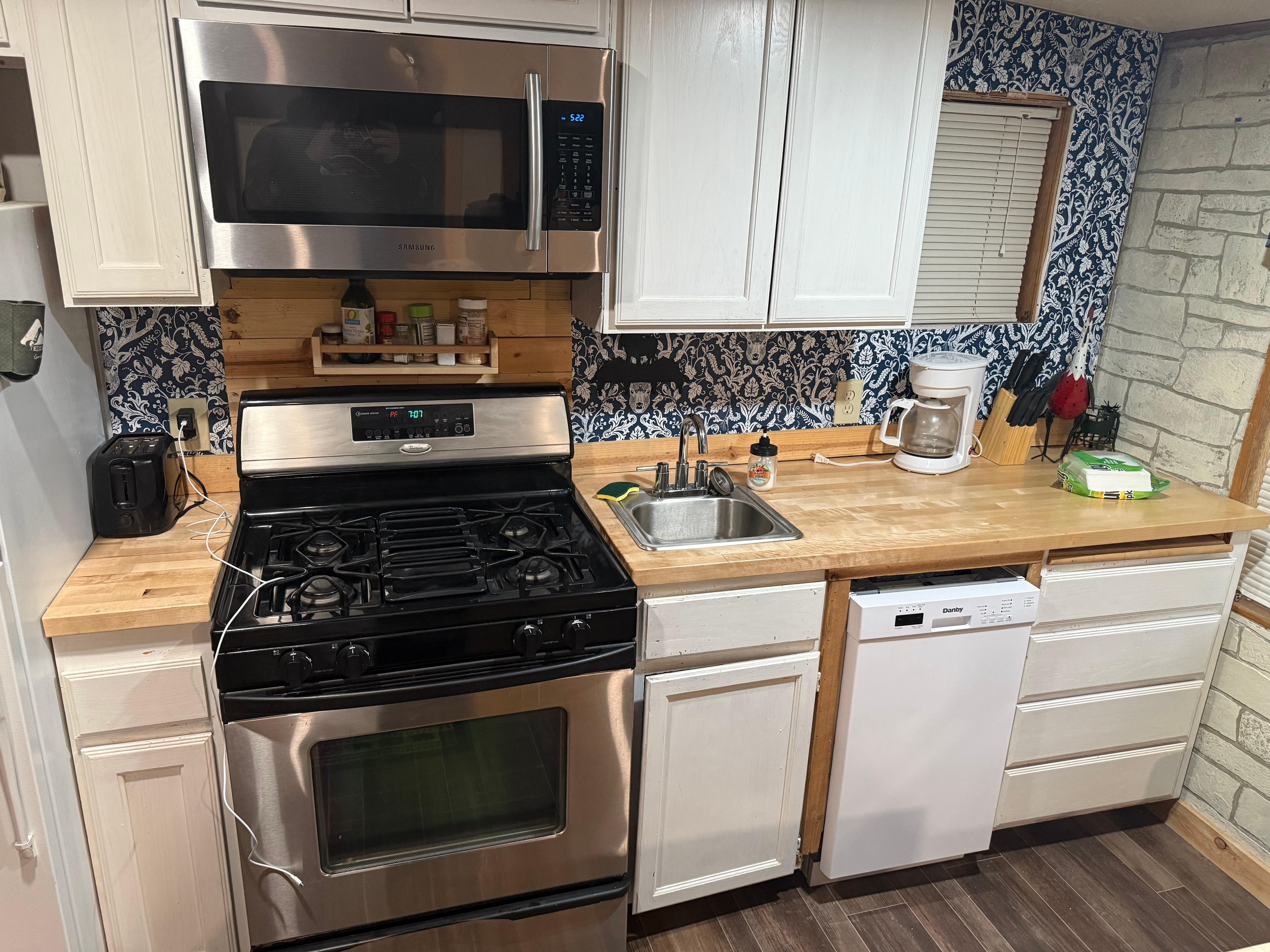 3 bed 1 bath Private deck with BBQ and table set, Lg. Natural light dining room, kitchen with a nice center island/eating space. Master bedroom w/ Logpole queen size bed, bunk beds in guest bedroom 2, Queen size bed in Guest bedroom 1. Main bath with tub/shower combo, sink & toilet. Large mountain decor living room with two couches and coffee table.