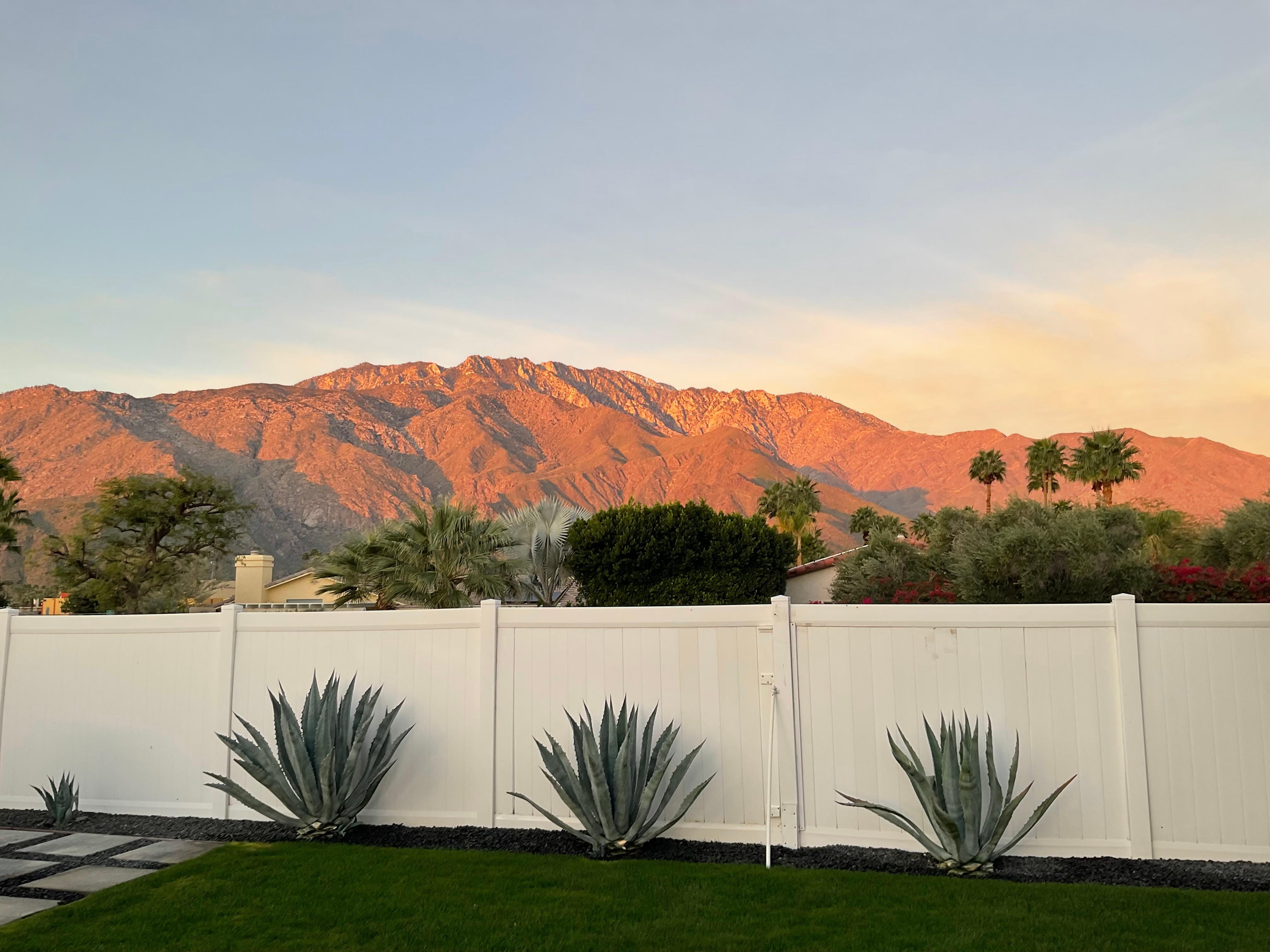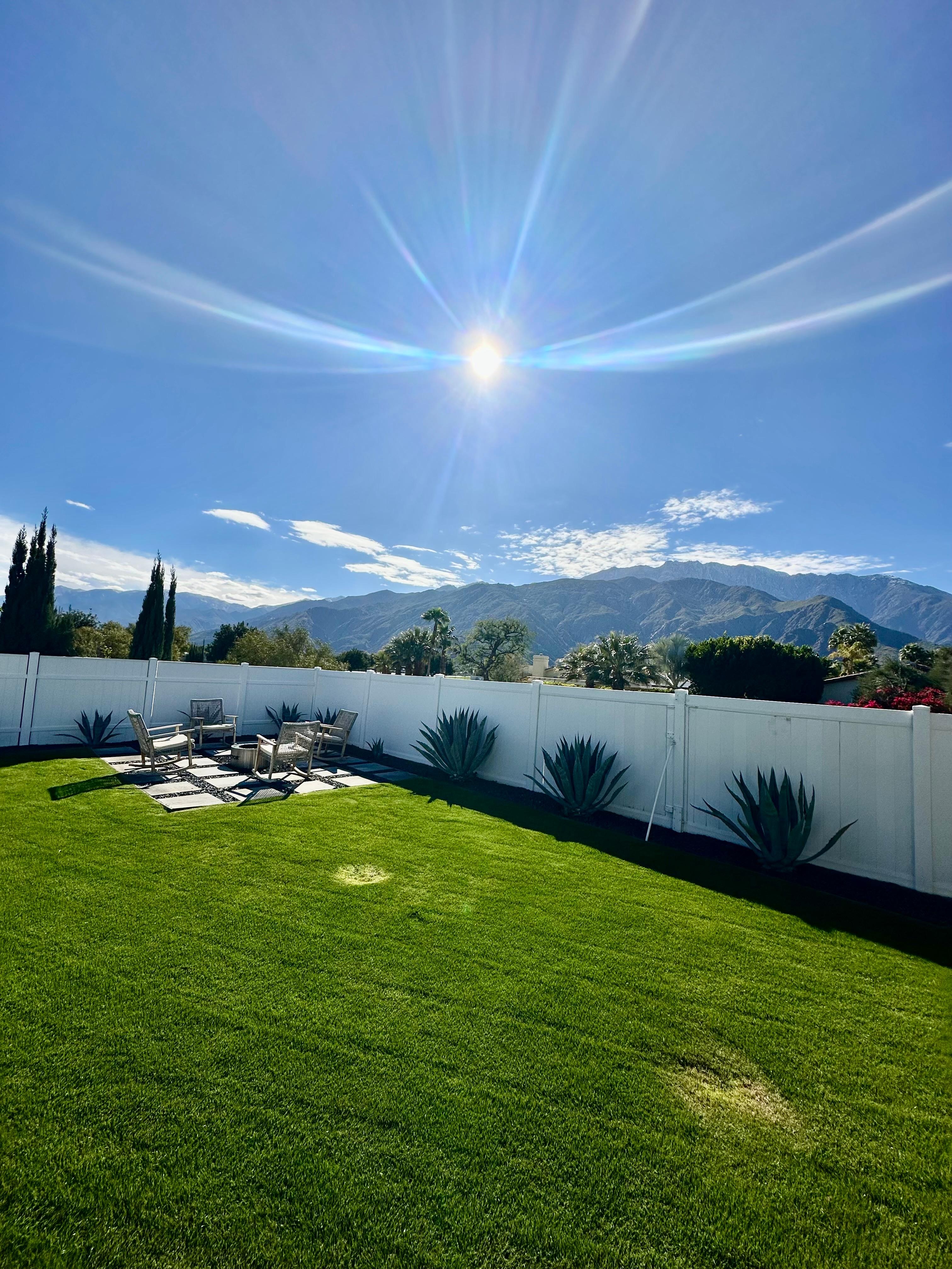 Welcome to this chill desert oasis boasting cool vibes of Palm Springs. This home sits on a corner lot with stunning views of San Jacinto Mountain and Santa Rosa Mountain range. This ideal modern open space floor plan features a large gathering living room and play card table area, a separate dining area with a large 10 ft. long kitchen island that can accommodate 4 more seating for dining. The kitchen boasts of high end appliances and totally fully stocked. Beyond the living room and dining room, the very private resort living outdoors invites you to step out, and you will be greeted by the magnificent mountain views, the pool, hot tub; tanning loungers, firepit, outdoor dining area with a large BBQ grill, outdoor TV, and an uber cool outdoor shower.