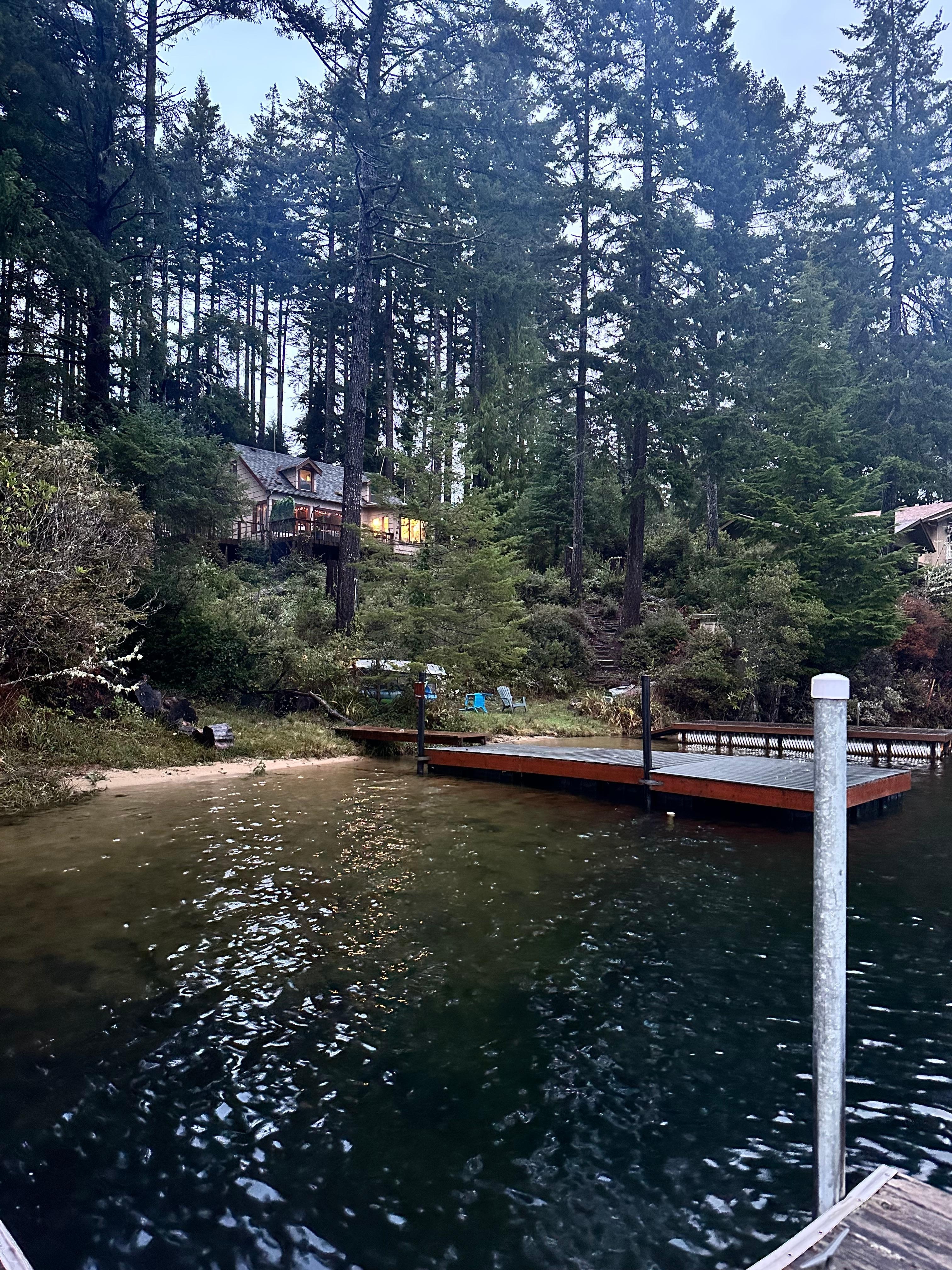 Walk outside to the large deck to find a wonderful space with seating where you can relax and enjoy the views and the fresh air. Take a soak in the hot tub to enjoy the early morning sky. This home has its own dock on the lake (a public boat launch is available just up the road), so you can bring along your own kayaks or boats, or simply jump into the refreshing waters of Woahink Lake and swim around.