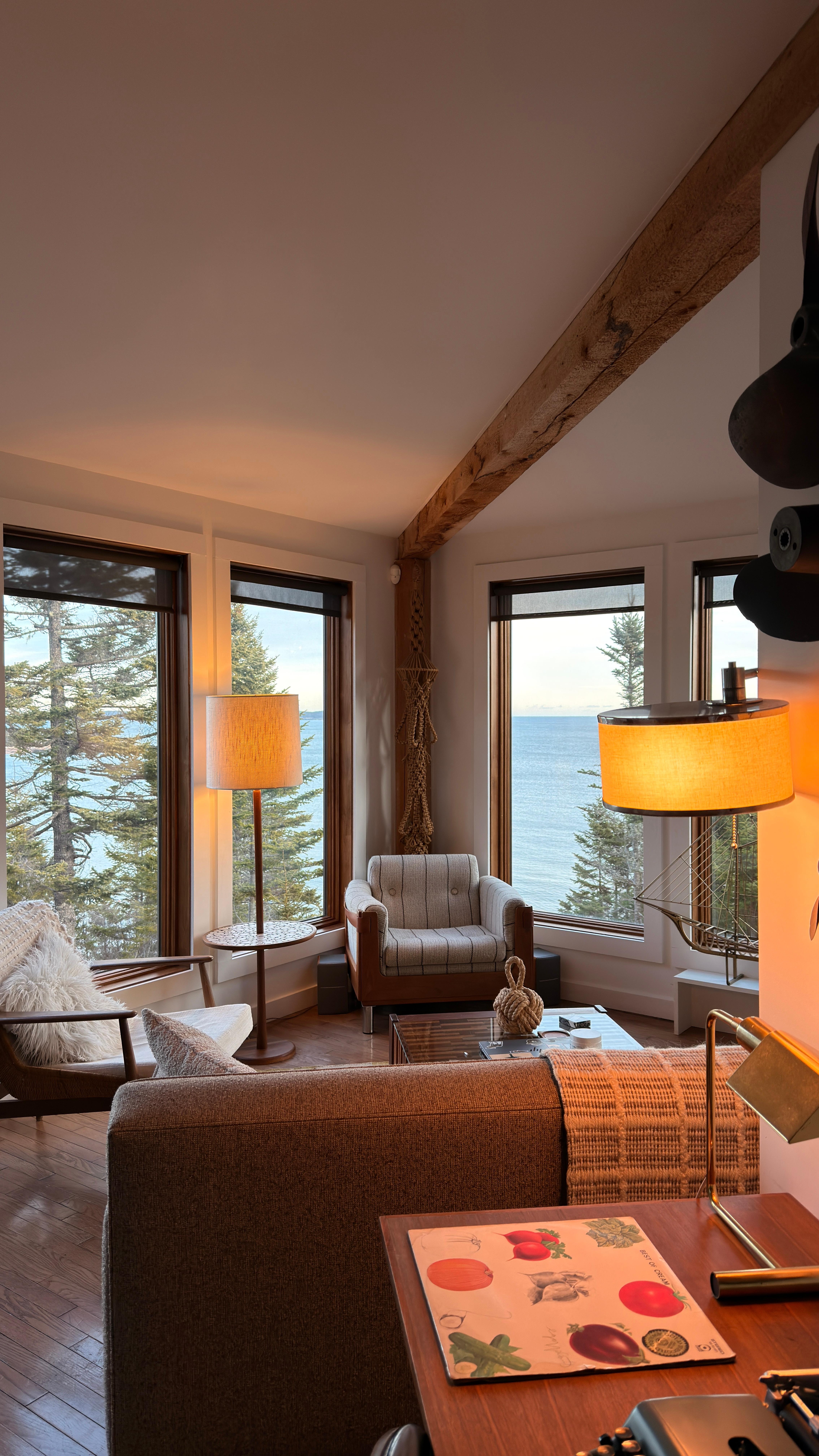 家の装飾のスタイルは、ミッドセンチュリーのモダンと航海の美学のミックスです。 e。チークと真鍮のビンテージ家具がたくさん。 プロウハウスは、すべてのモダンな設備を備えて新しく改装されましたが、ドアを歩くと50代または60代に足を踏み入れたように感じるでしょう。 たとえば、世紀半ばのモダニストポールマッコブ、ノーマンチャーナー、パーシバルラファー、カーティスジェレによる家具、アート、デザインがあります。 図書館のコーナーには、デンマークの机、ビンテージの本、古い回転式電話、Olivettiタイプライター、古典的なThorensターンテーブルがあります。 家のいたるところにある絵画や写真のほとんどは、自然や航海をテーマにした型破りなものです。 (本当の取引がちょうど屋外である場合、海の船長と灯台のトゥイーペインティングを期待しないでください。)
