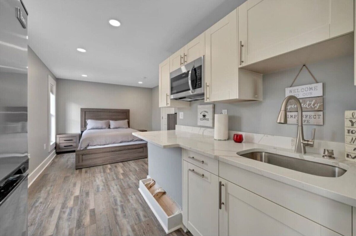 This Studio Loft has a stunning kitchenette (no stove) design that utilizes the smaller space very well with high-quality cabinets, countertops, proper lighting, and even gold fixtures for a beautiful interior design. There is a small bench next to our refrigerator that you can pull right up to the counter to have a meal for two or can be used as a mobile workspace for those that work remotely. We have a 50` flat smart TV and free WiFi to stream all of your favorite apps such as Netflix, Hulu, Disney+ etc. The newly remodeled bathroom not only has new subway tiles and a glass shower door but comes fully stocked with bath towels, wash clothes, and hand towels. Our Studio Loft also comes with complimentary Essence body wash, shampoo, and conditioner and the bed is made with new clean linens as well. We have a common area laundry room with dual washer and dryer stackable’s for those who need to wash up during their stay.
