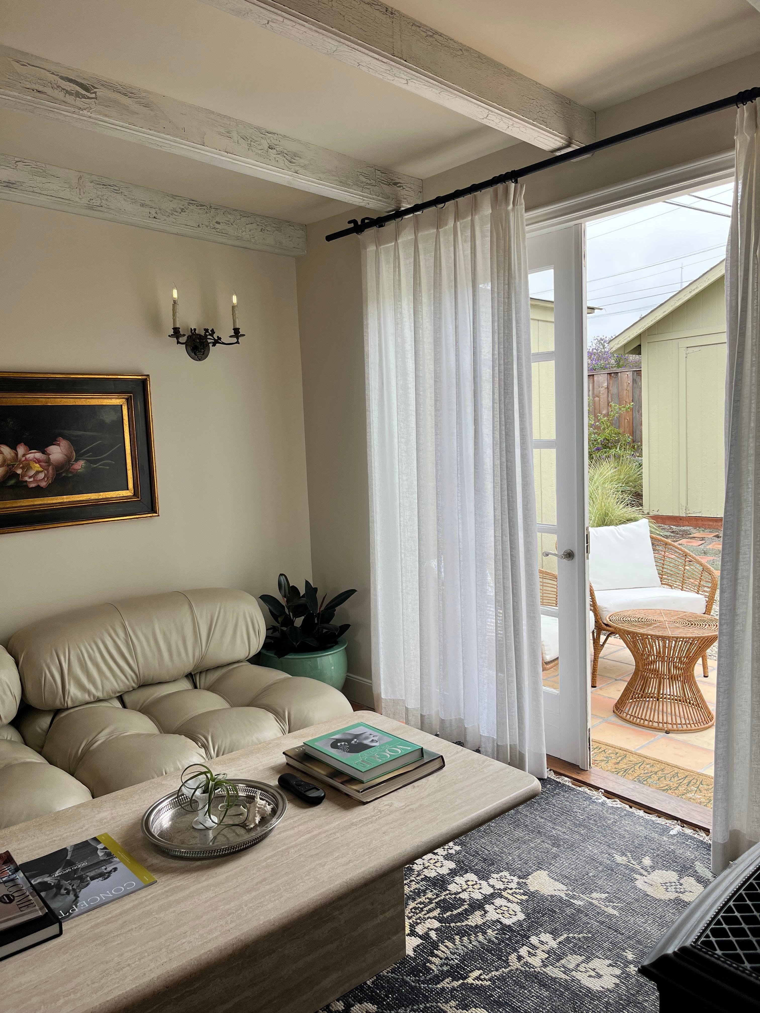 Enter through a cedar dutch door and consider leaving the top open to let in the coastal breeze. Walk into the living room on terra cotta floors- notice the antique ceiling beams, gas fireplace for ambiance & heat, Mario Bellini leather couch, large travertine coffee table, and French doors that lead to the backyard.