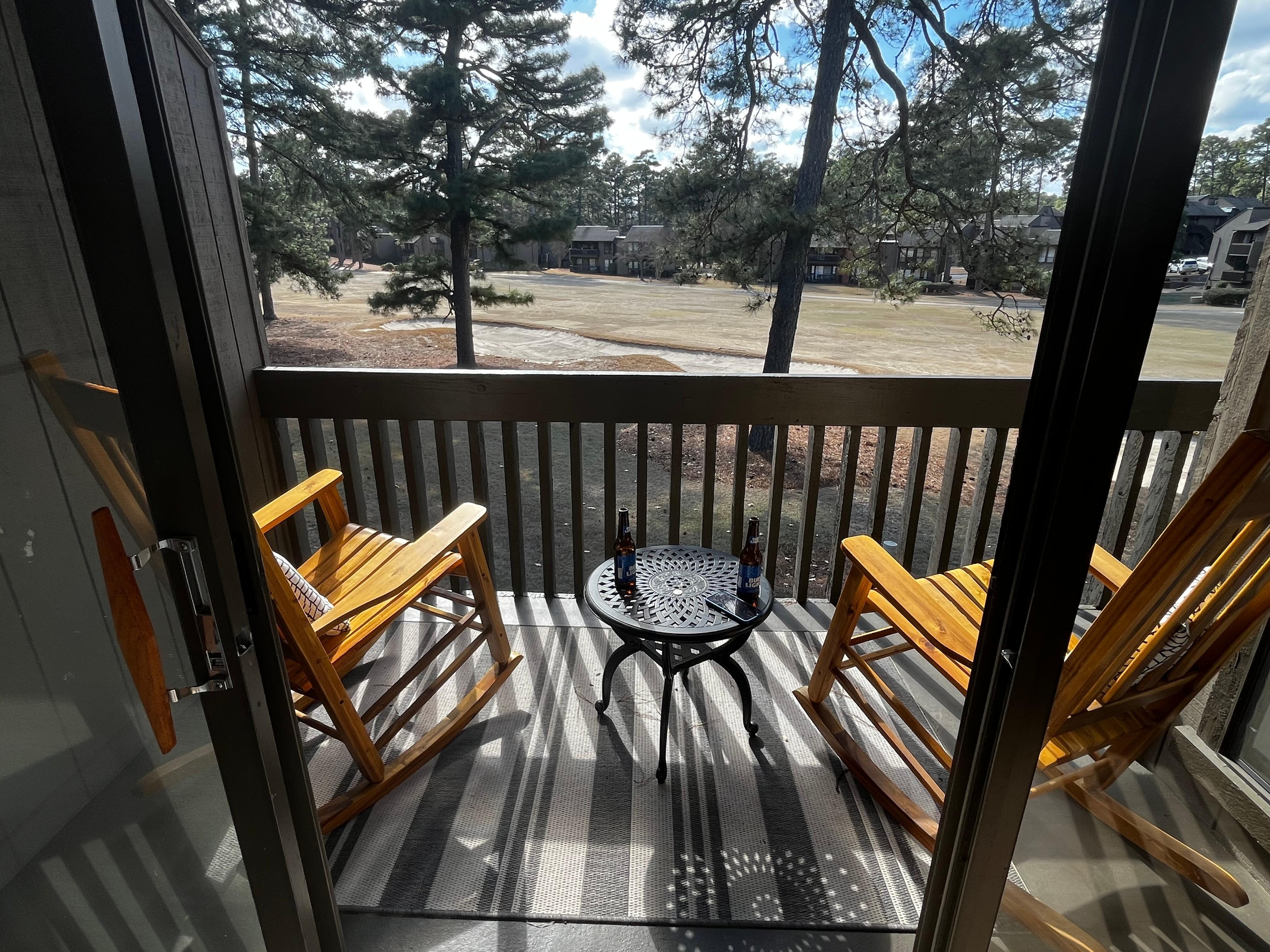 It’s the perfect place to start the day with coffee while watching golfers tee off or to relax in the evening surrounded by Pinehurst’s tall longleaf pines and fresh Sandhills air. Cardinals, chickadees, and wrens are frequent visitors to the trees nearby.