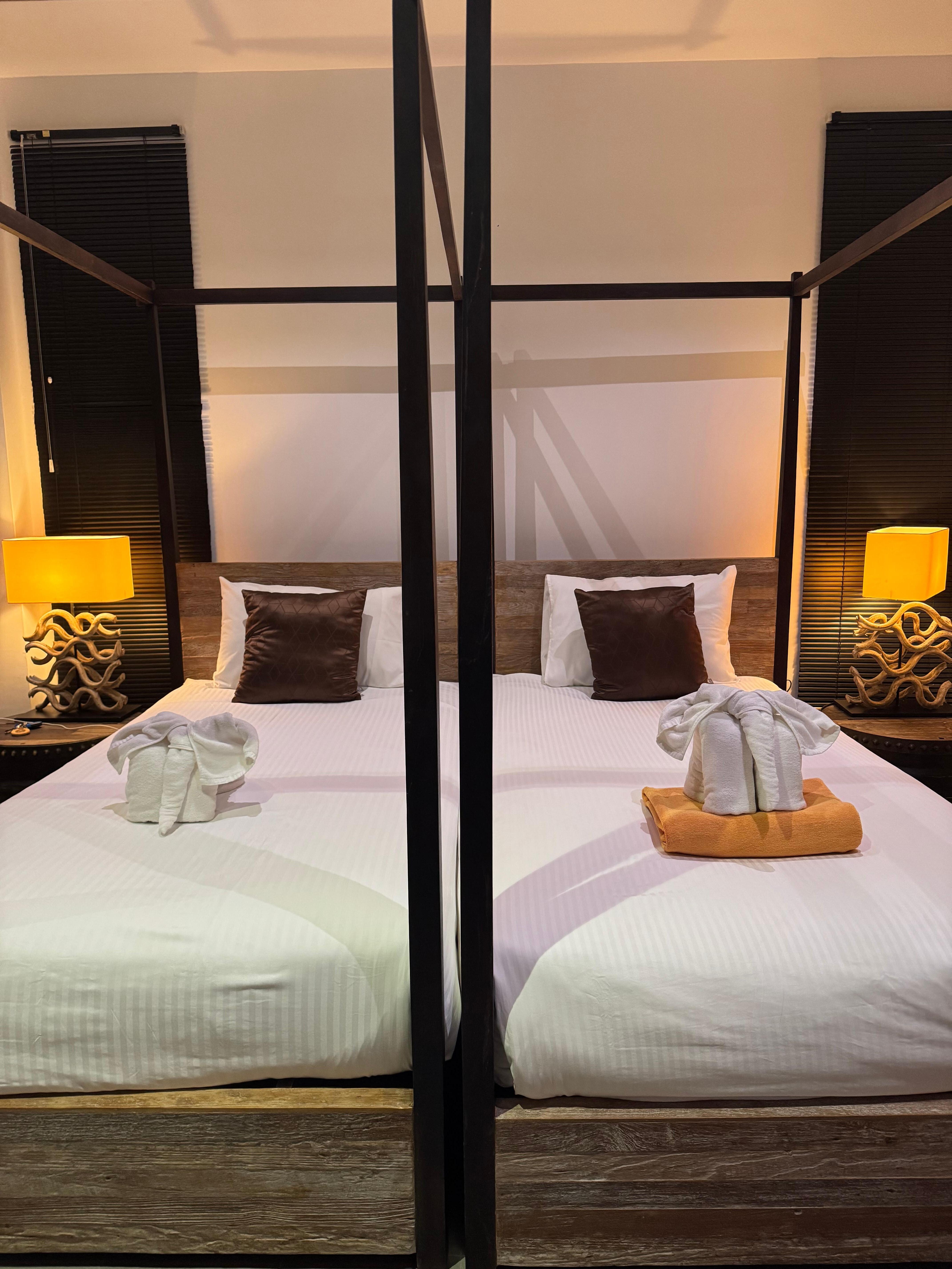 -オリエンタル風の装飾が施された、快適なベッドルーム3室、エアコンとシングルベッド2台。