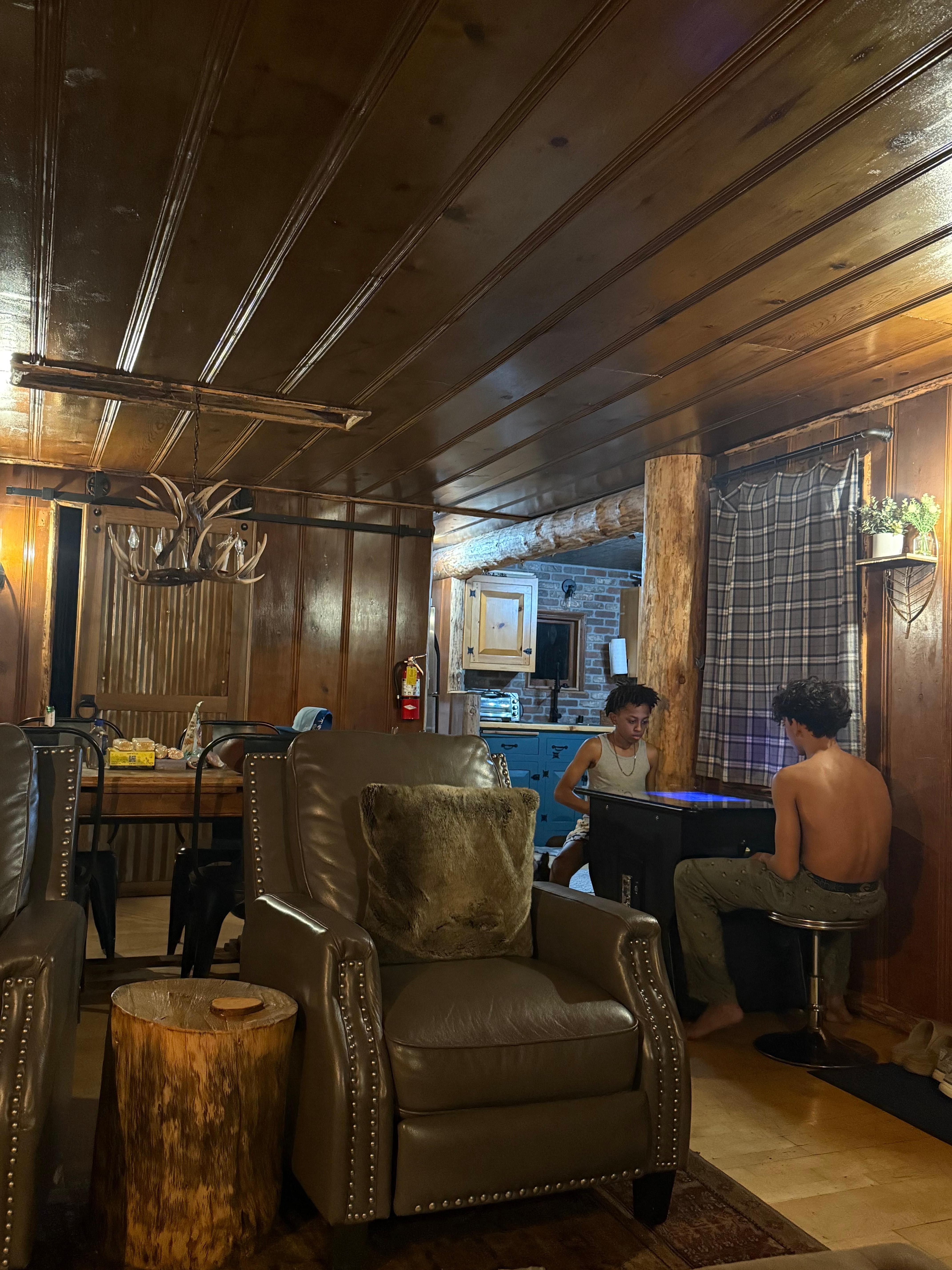 As you enter into this amazing cabin you will immediately feel transported to an incredible mountain living experience, the cozy ambiance and mountain decor make you feel right at home in the mountains. The main living area offers plenty of comfortable seating on a sectional couch and leather chairs surrounding a wood burning fireplace and smart flat screen tv. Located just off of the living area is a dining table with seating for four and a Pac Man Arcade game! This living space welcomes you and your group to gather together and create lasting memories.