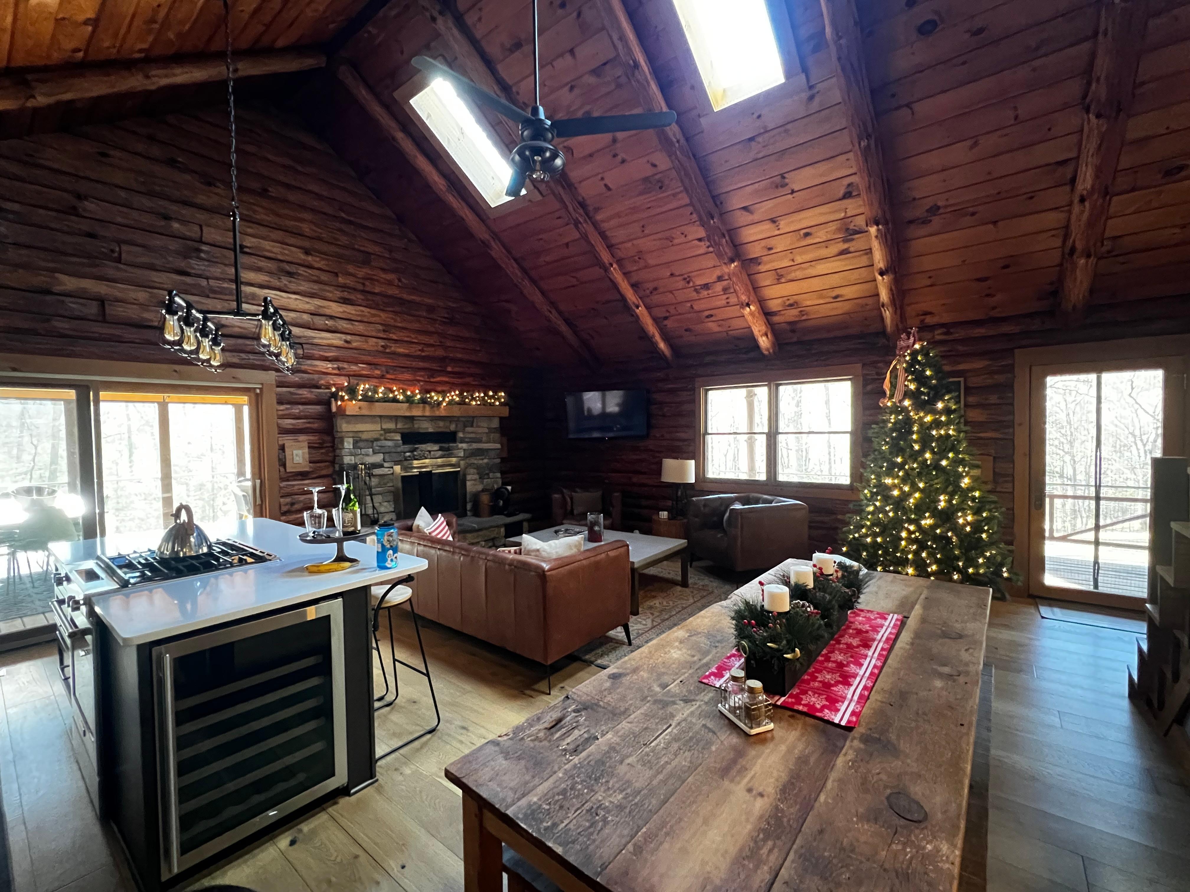Tucked away, this secluded cabin offers the best of both worlds—serenity and convenience. Whether you're sipping coffee on the large screened-in porch, soaking in the hot tub under the stars, or gathering around the fire pit for s’mores, every moment here is designed for relaxation. Inside, you’ll find heated bathroom floors for cozy comfort, a fully equipped kitchen, and stylish modern touches throughout.