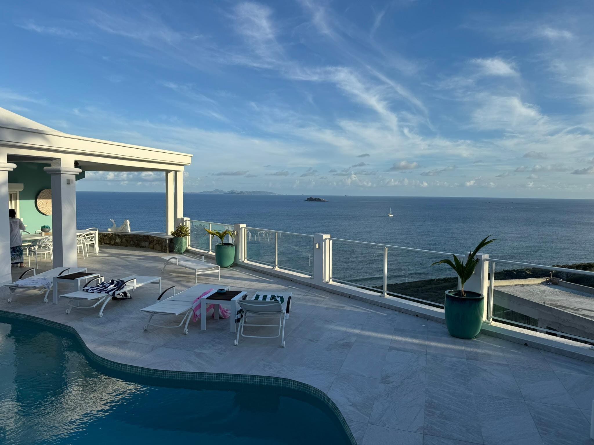 The massive outdoor living room is integrated into the pool deck and expansive terrace, creating a haven for relaxation, complete with comfortable seating and a tropical ambiance that captures the essence of the island’s gentle breezes as well as the expansive views of St. Barths and the surrounding islands to the south. Villa Sophia’s private pool invites you to take a refreshing swim while admiring the endless views of the sparkling Caribbean Sea. The alfresco dining area is perfect for enjoying meals under the stars, accompanied by the soothing sound of the waves.