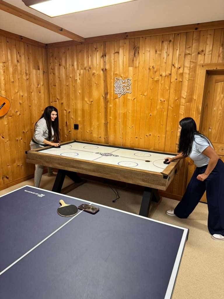 When it comes to indoor entertainment, the home boasts a game room on the lower level, which features air hockey, arcades, a Roku TV, foosball, billiards, ping-pong, shuffleboard, a poker table, and a variety of card games. You will also find a Ladder Ball set, a cornhole game set and giant Jenga.