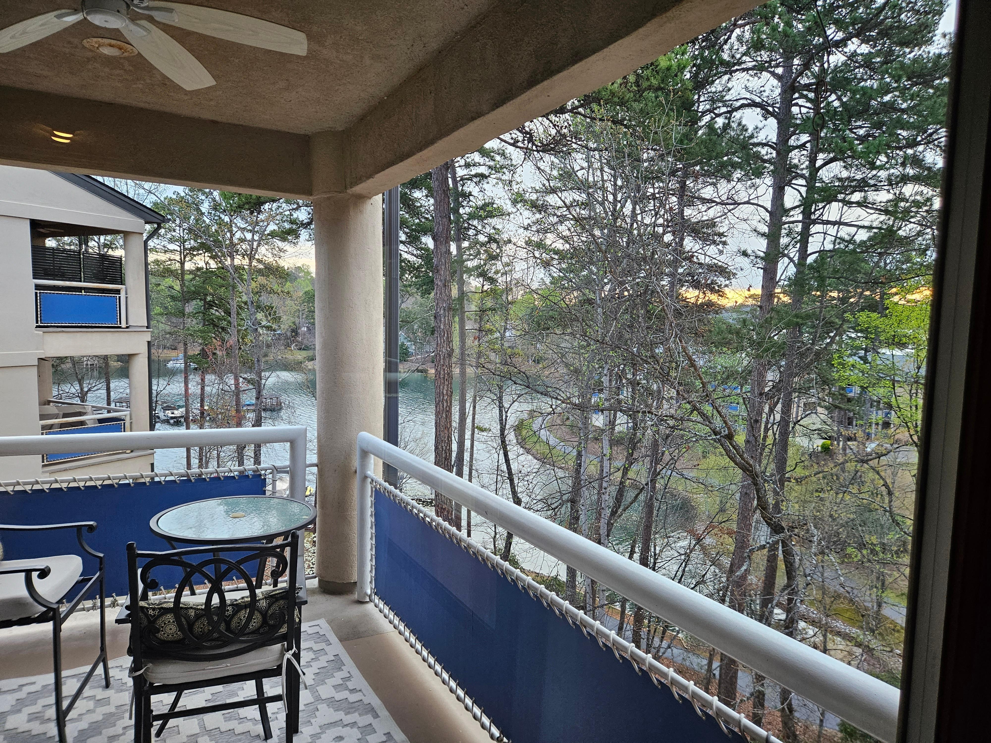 The well-appointed kitchen includes granite countertops, knife set, cooking basics, coffee maker, blender, and electric water kettle. The living room includes two swivel chairs, two leather chairs, and a leather (pull-out) sofa. There is also a dining table that seats six and a modern bar with a beverage refrigerator. The large TV includes YouTube TV and other apps for viewing live games. The private balcony includes a ceiling fan, seating for six, and lake/marina views.