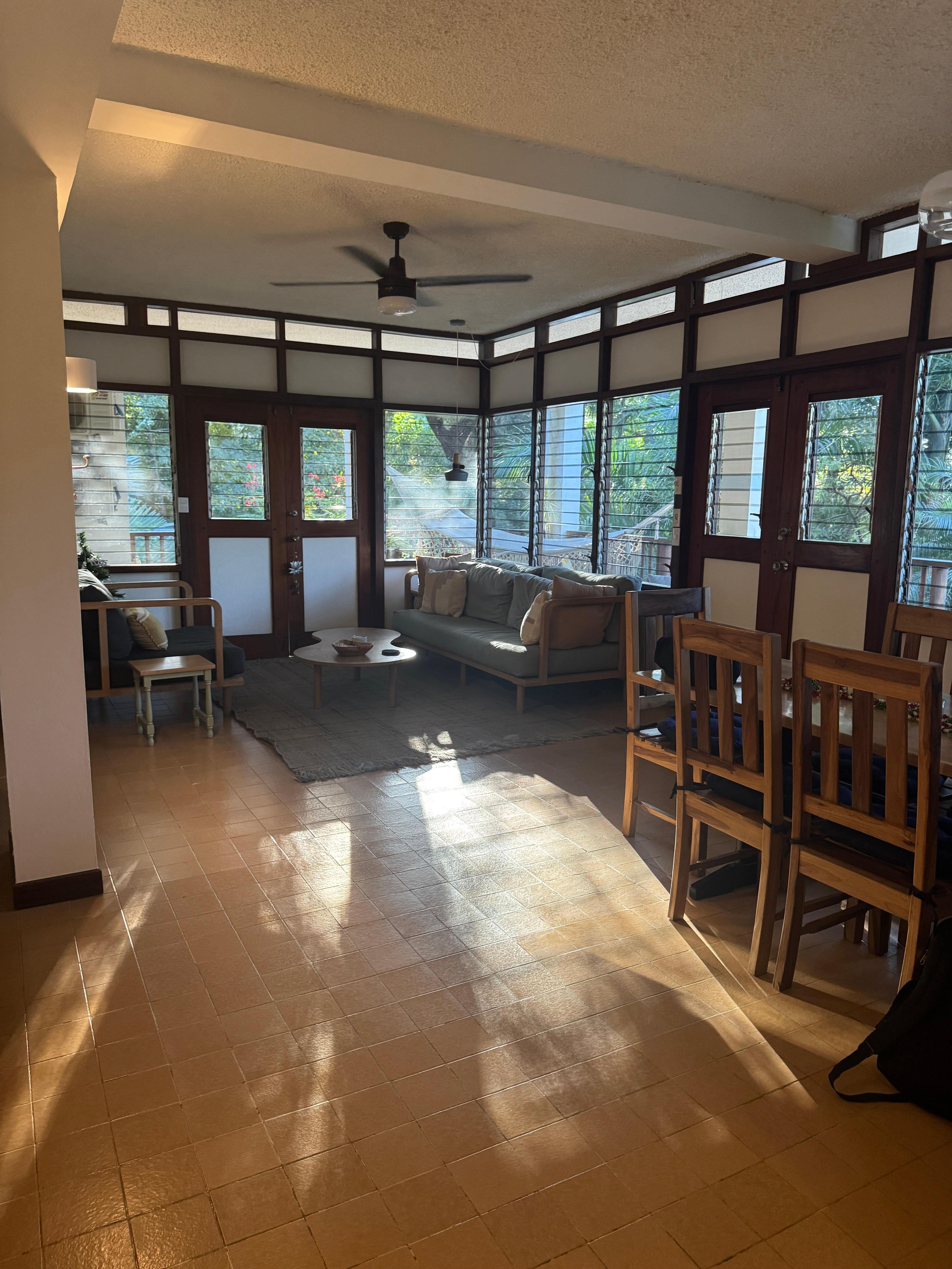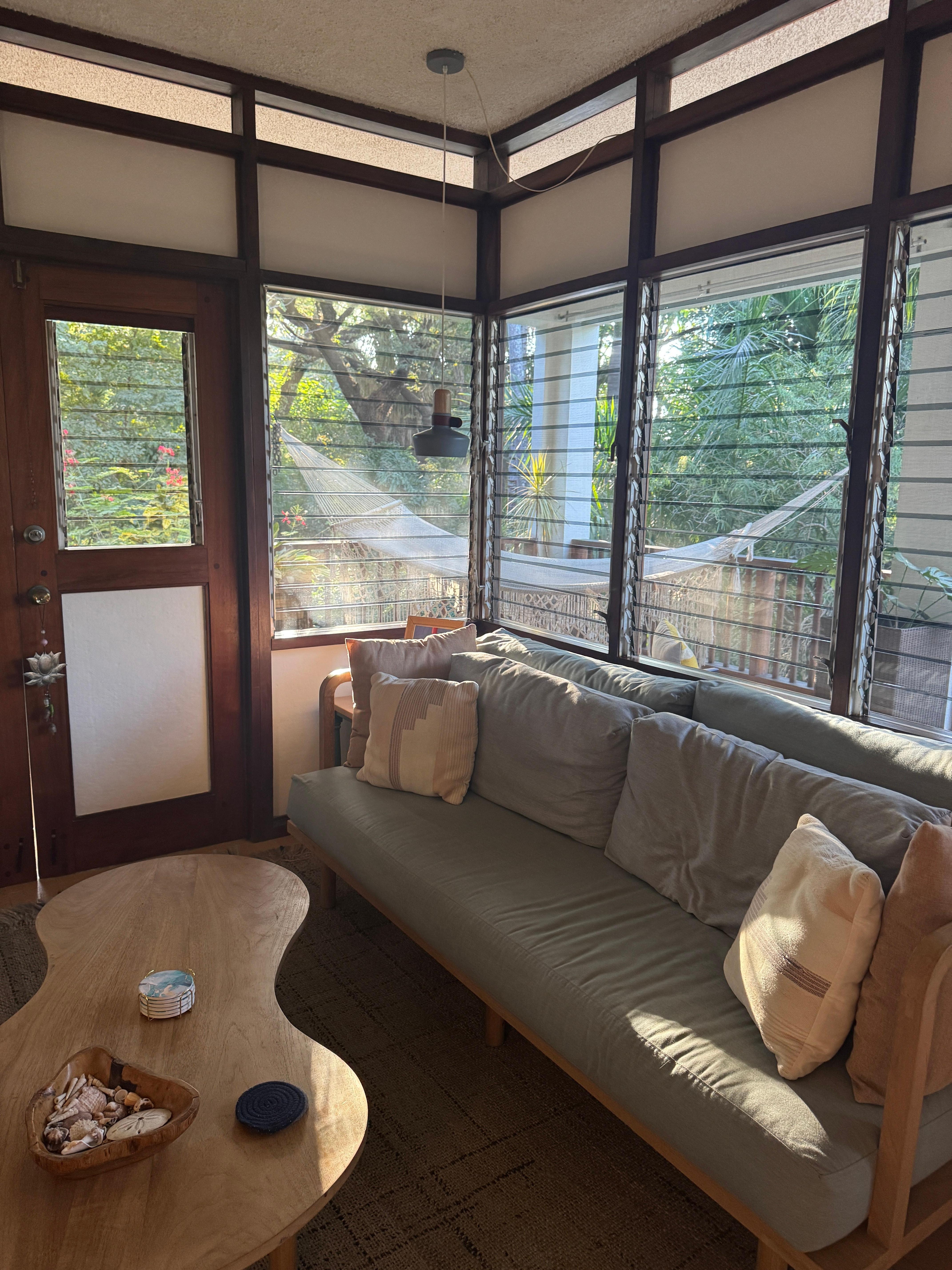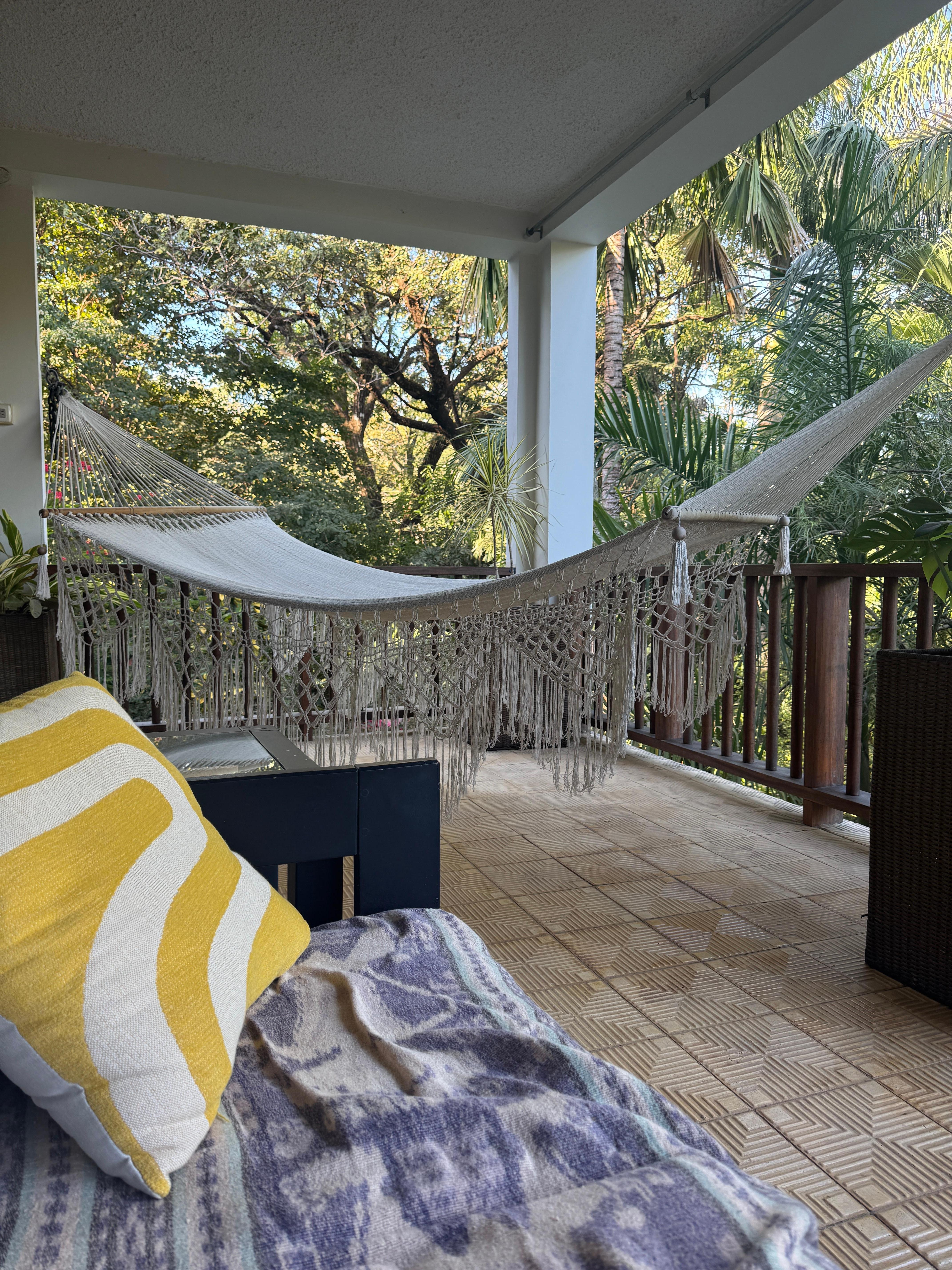 Come be one of our first guests at Casa Devi, a sweet sanctuary just 1 minute walk from the gentle waves of Playa Pelada, as close to the beach as you can stay in Pelada or Guiones due to the protected Turtle Refuge. Located in the heart of Costa Rica’s Blue Zone, Casa Devi is your place to rest, reset, and reconnect. There are 12 units and Casa Devi is the corner unit, closest to the ocean and surrounded by the jungle canopy. It is a spacious, light-filled condo — over 1800 square feet (171 sq meters) of easy, beachside living. I love the location as it is an easy walk to everything- Guoines is 10 min walk. Plus there is a community pool with great views! Two bedrooms, each with its own AC unit, Strong wifi and new smart TV in guest bedroom. Two full bathrooms plus a private back patio and large, wraparound porch with views of the jungle — perfect for relaxing after a day at the beach
