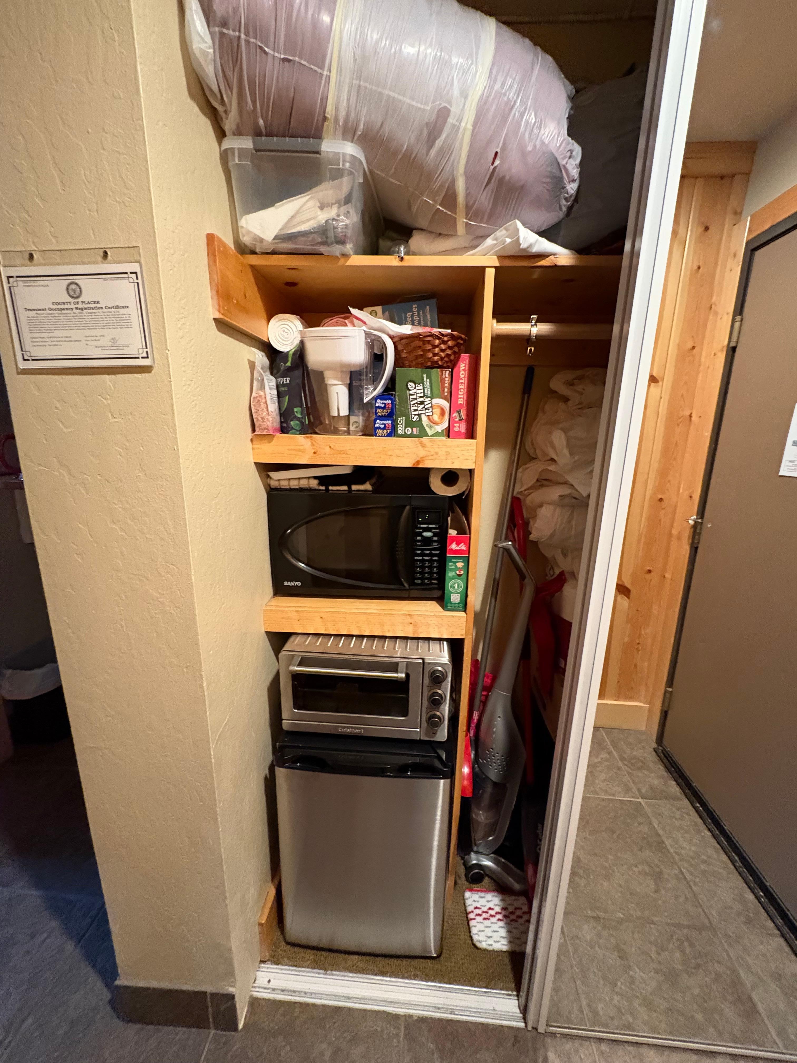 Though compact, the kitchenette is thoughtfully equipped with a mini fridge, microwave, and toaster oven, ideal for simple meals and snacks between adventures. Step out to the communal outdoor area, where kids can play and guests can gather beneath the pines.