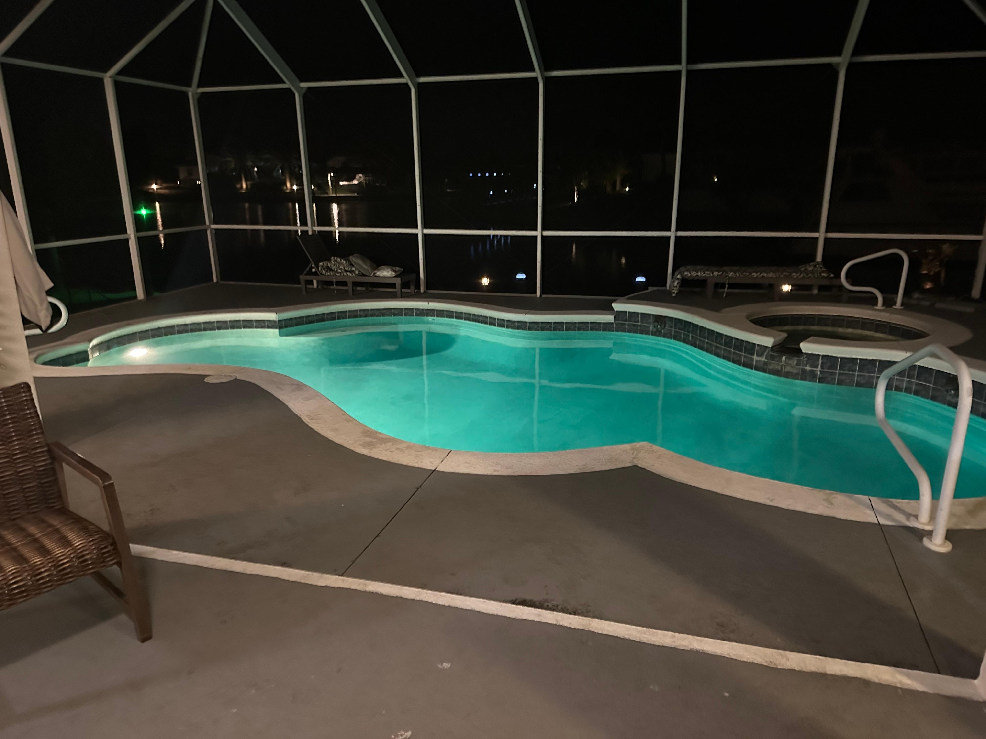 This beautiful one-level canal-front home offers the perfect blend of comfort and privacy with a split-bedroom floor plan—ideal for families and friends vacationing together. The master suite features a king bed, en-suite bathroom, and direct pool access. The second bedroom has a queen bed, and the third offers two twin beds; both share a full bathroom. Enjoy the cozy wood-burning fireplace, large Smart TVs in every room, and a fully stocked kitchen with every gadget for great meals and cocktails. Step outside to a screened pool enclosure with a saltwater pool overlooking stunning sunrise and sunset views. The private dock invites you to fish, relax, or dock your boat and jet ski. A true Florida waterfront retreat!