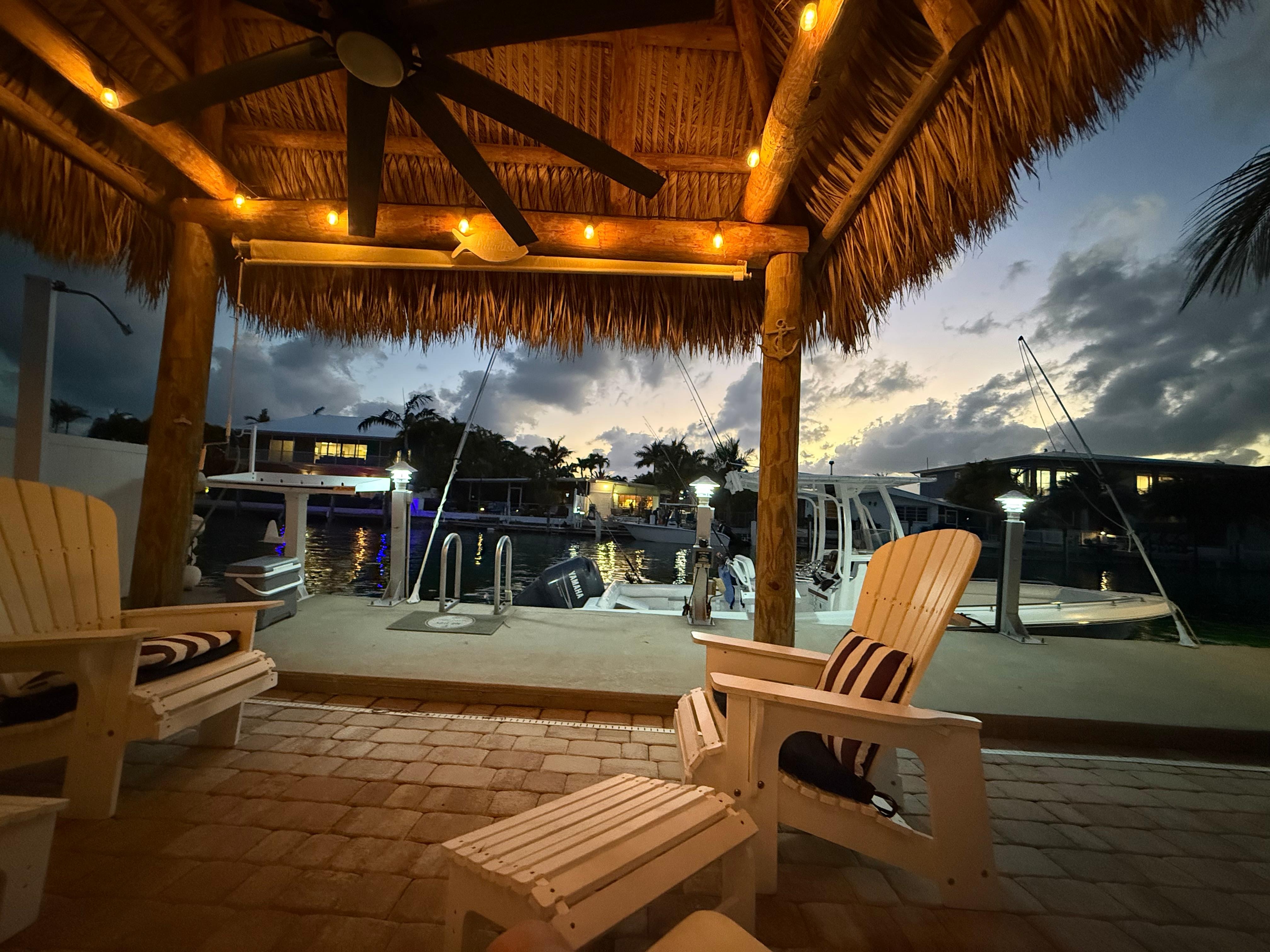 家の最良の部分...真新しいTIKI小屋を特色にする広々とした居心地の良い裏庭、私たちの裏庭はプライバシーフェンス&造園、屋外シャワーと魚の清掃ステーションで部分的に人里離れたです。 ドックエリアは37.5フィートのドックの広い運河を見下ろし、電気、屋外照明、そして最良の部分を提供します:水中の緑色の魚の光!