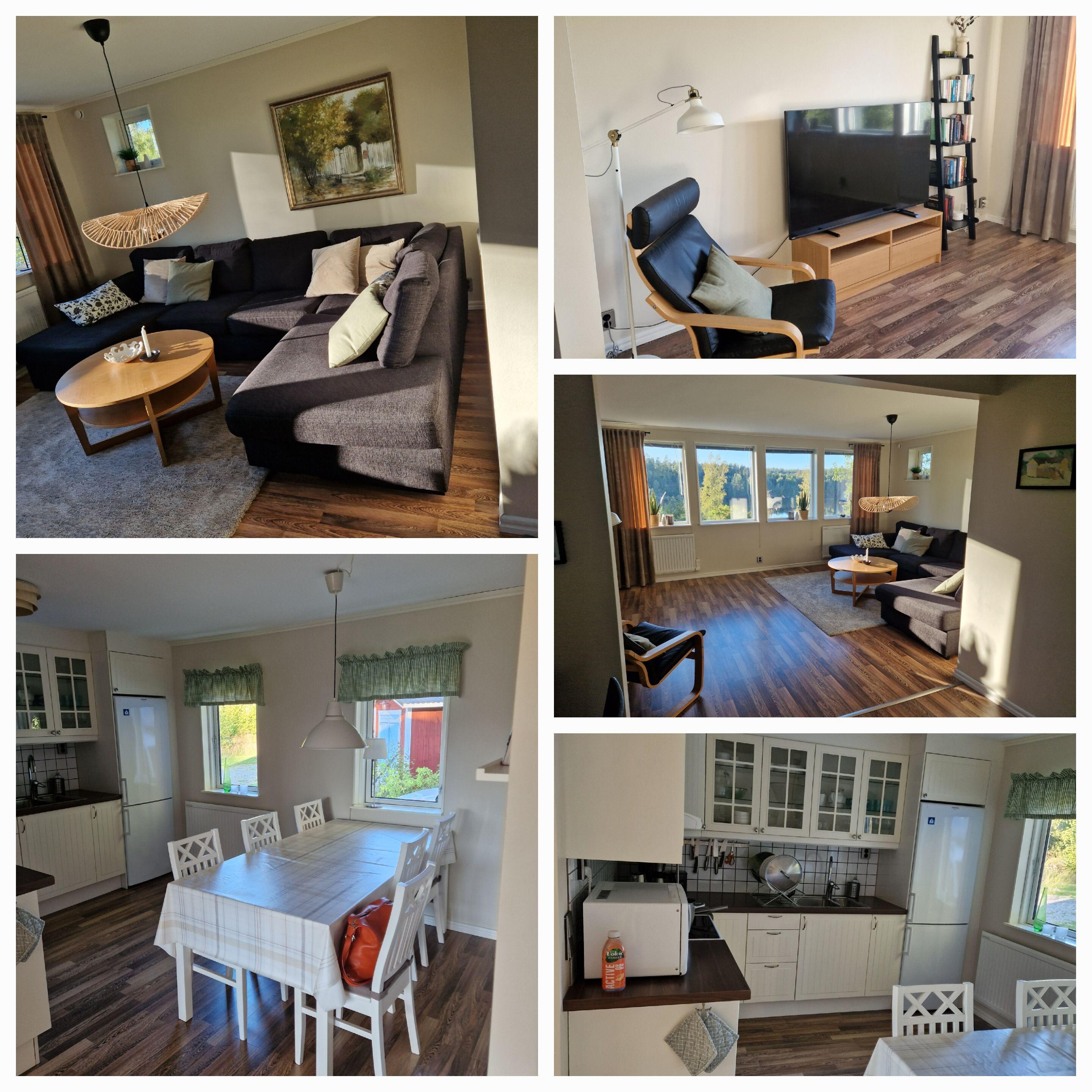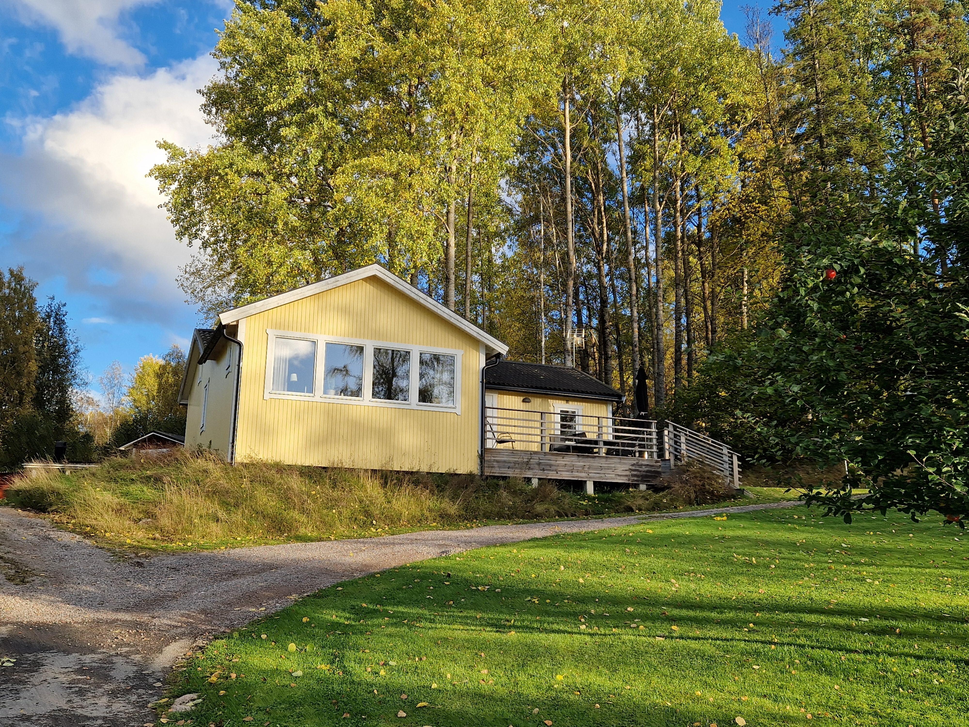 The house was built in the 50s and renovated in spring 2011 and furnished with new furniture. The house is 80 sqm and is suitable for 6 persons. It has three bedrooms, a spacious living room, kitchen with dining area and fully tiled shower room with toilet, sink and washing machine. The rooms are divided into one with a double bed, one with two single beds and one with bunk beds. The living room is bright and airy with views of the lake and equipped with a large sofa and 42 inch TV. The kitchen is equipped with stove, ceiling fan, fridge / freezer, microwave and coffee maker. Large sunny terrace overlooking the lake, garden furniture with seating for 6 people and umbrellas. Access to the rowboat and swimming ability. Fishing in the lake is possible. There is parking at the house.