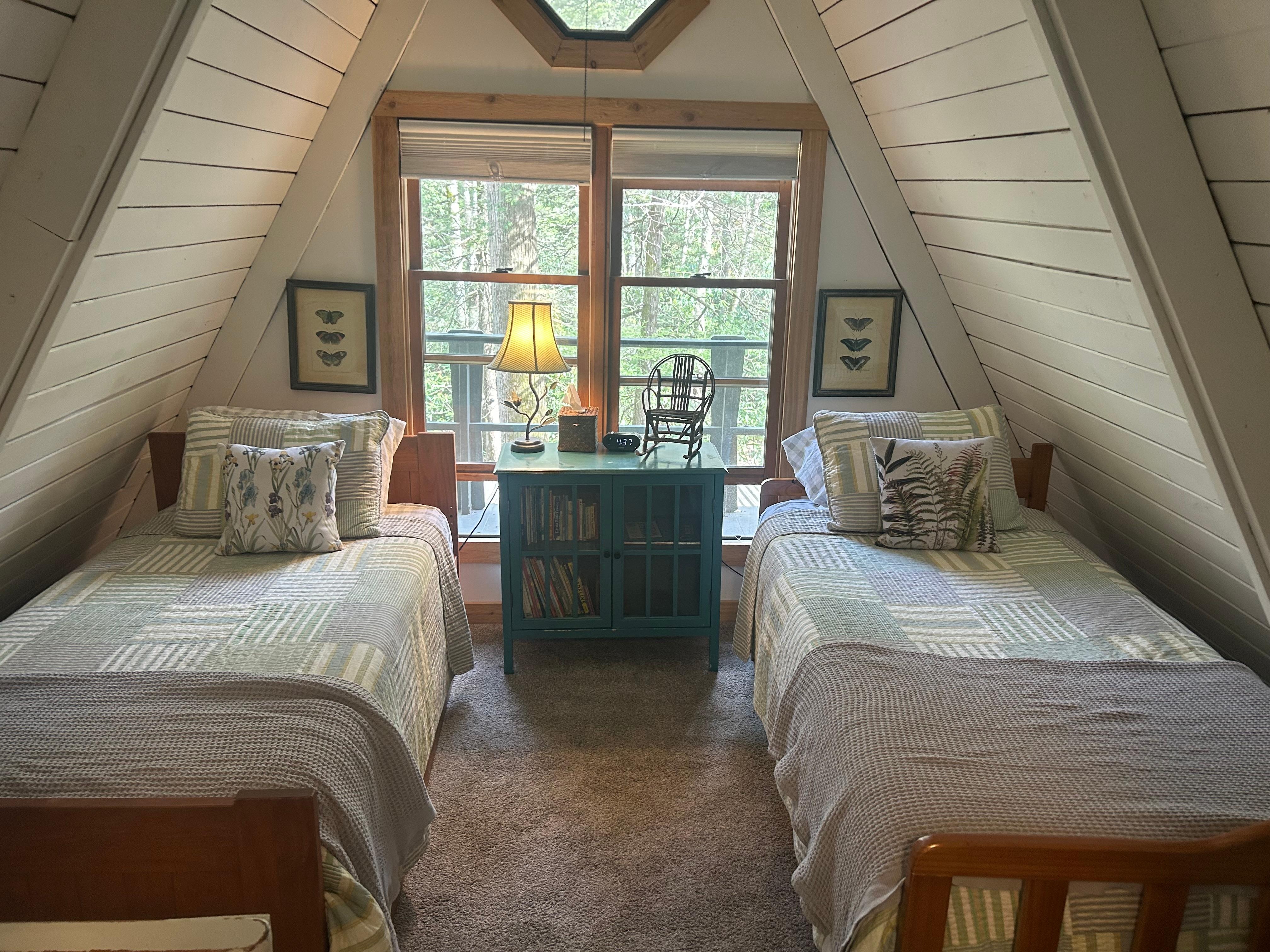 マスターベッドルームにはキングベッドがあり、2階のロフトとベッドルームはツインベッドで4つ寝ます。リビングルームにはクイーンスリーパーソファがあります。 メインレベルに1つのフルバス、ロフトに1つのハーフバス。 背中の覆われたデッキは、せせらぎの小川や滝の音を聞きながら、乾いた状態を保ち、デッキのすぐそばで多くの餌を食べている鳥を観察し、木々や山の栄光のプライバシ ーを楽しみます。