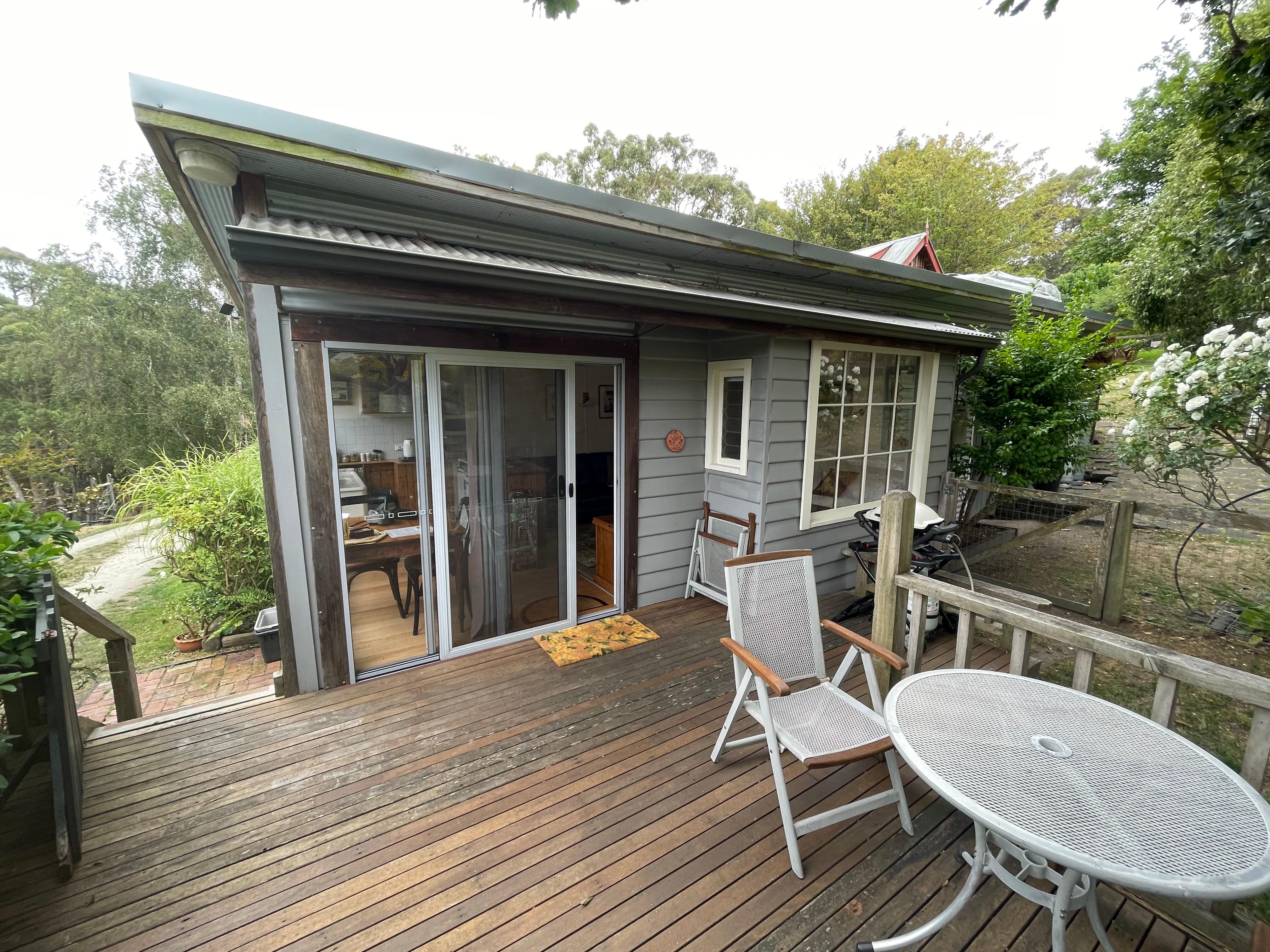 The studio is in the village of Lorne situated in a quiet garden setting where a few parrots and roos can get quite friendly. The deck (4.5 × 3.5 meters) along a small pocket of garden are fenced together for your dog. Fencing is 4 foot high. . Even though the studio is small it has all your conveniences... a small kitchenette, heating/air conditioning, queen bed, TV, DVD, (no internet) and a BBQ and deck furniture. The main street and foreshore of the town is only a 15-minute walk down the hill. We have a great dog beach which is 24/7 all year round.. Our studio is built with second hand materials and furnished in a similar way. Modern we are not! Check in and check out times are fairly flexible. Generally, we say 1 pm check in and check out 10:00. Times can go either way, depending on the comings/goings of other guest. Goose Crossing is a perfect getaway for you and your dog for a short stay(and not breaking the bank).